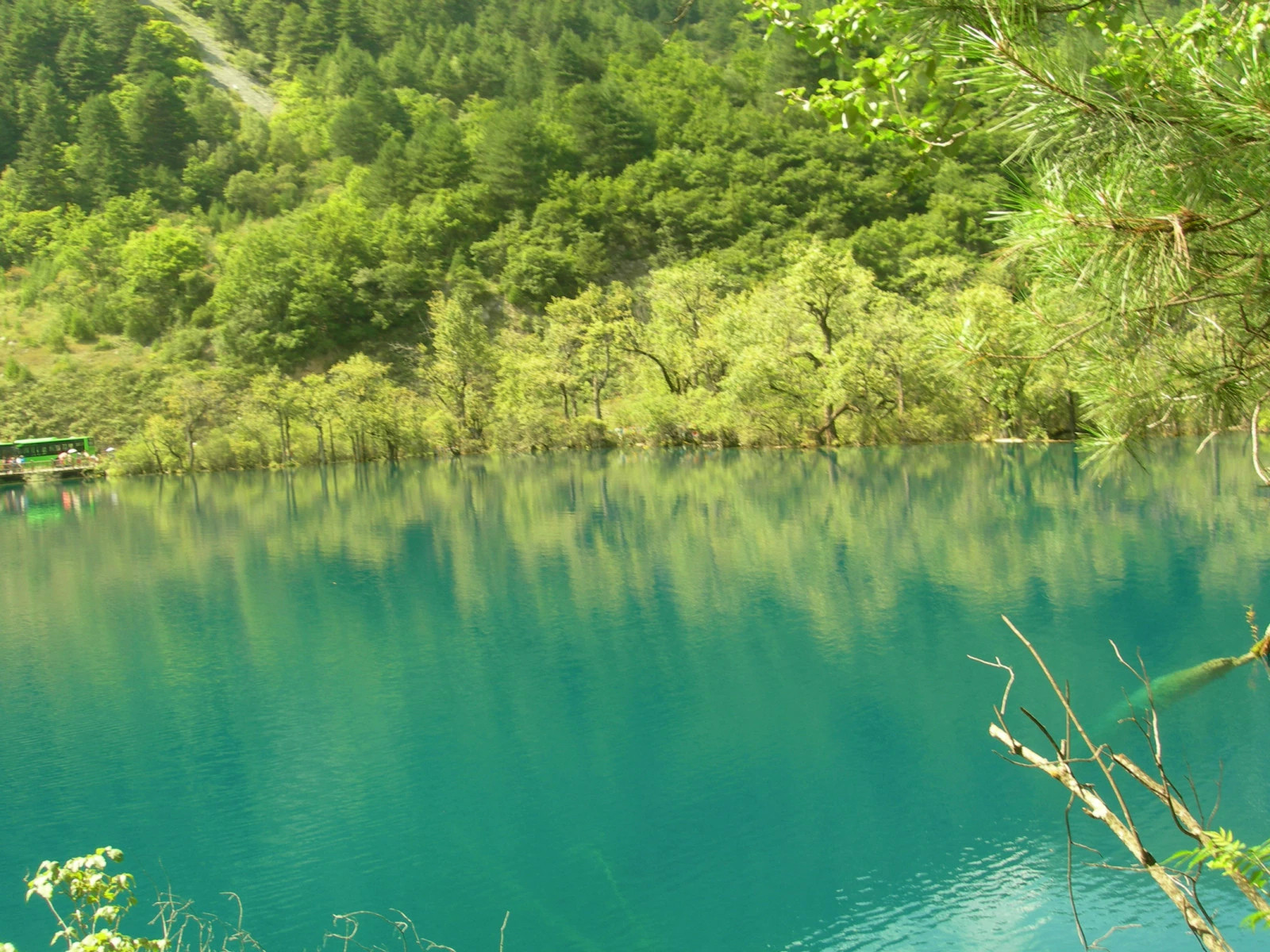 九寨沟的每一个海子都是人间仙境,各有各的特性,各有各惹人喜爱的地方,充满了诗意,让人百看不厌。九寨沟的海子美,美得让人如置画中,流连忘返,令人难以相信。她是那么地清,纤尘不染,一米、两米、十几米乃至几十米深的水清澈见底;又是那么地绿,晶莹剔透,像丝绸一样光滑柔顺,让人不忍触摸;还是那么地静,像一片硕大的天然宝镜,镶嵌在青山绿树中间,将满山的风景尽收其中,让你丝毫感觉不到水在流动。清风徐来,如镜的水面顿时微波荡漾,阳光下,波光粼粼,如同跳跃的小火花,有种让人忘却自己身在何处的感觉。感叹大自然居然有如此杰作,造就出这样绝色的水来。海子的水,有着与众不同的颜色,蓝得仿佛平铺着蓝宝石,晃动着天上漂浮的白云,荡漾着山间茂盛的树林,裹挟着林间悦耳的鸟鸣,倒映着雄鹰飞翔的英姿,盛载着藏民神圣的祝福,在平静的水面上轻柔地滑过,通向前方的幽谷,让人情不自禁地产生一缕缕无限的遐思。于是,水中狭长的溪鱼仿佛通人心似的,也轻歌曼舞起来,摆动起俊俏的尾巴,在水面悠然穿梭嬉戏,神秘地张望,轻快地在水底的古树藤蔓间游弋,尽情地舞蹈,为山泉增光添色,乐此不疲。恍惚中,你的眼前交叠着空中游动着鱼、水中飞翔着鸟的动人画卷。那明净的水,波澜不惊,透明得如同一面镜子,纯净得没有一点杂质。这里的水,是云贵高原雪山中流动的清泉,无论水多深,你都可以看透沉寂在水中的一草一木。那种清澈,是少女的眼睛,没有被任何邪念侵蚀过。静静地躺在海子里,水是神秘的天蓝色,静谧的碧绿色。蓝得天水一色,让你分不出哪是天,哪是水;那绿,连玛瑙也会在她的面前黯然失色。这些蓝和绿,哪怕高超的画家恐怕也难以调出,就像具有幽深富有内涵的女子,娴静地舒展着自己的身姿,尽情地敞开一身的胴体,怎么也瞧不够。流连其间,心灵自然而然得到了净化,浮躁之心烟消云散,亦如她一样的清澈明洁。我好多次想弯下身子和九寨沟的水亲吻一下,但看到没有一个人这样做,自己也终于作罢,甚至回来后还有些后悔,后悔自己当时的一丝杂念,玷污了她的圣洁。这就是九寨沟的魅力。她的纯洁无瑕,感染着每一个到过九寨沟的游客。近处绿水,清澈见底;远方蔚蓝,平静无波;两岸山树,映入海中。以绿为主调的色彩和周围宁静的环境,使游人恍如踏入仙境。因该地森林多,地层是石灰岩,含大量碳酸,对水起净化作用,所以水的透明度有的达30米。透过清亮的水,湖底的藻类、沉积物和山峰树影一起映入眼帘,显得五光十色。