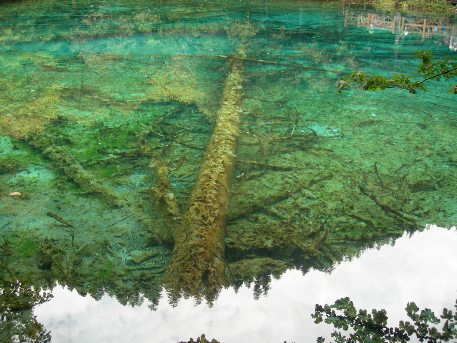 五花海中的水,近看,清澈而透明;远观,呈宝石般的蓝色,属孔雀蓝的那种,晶亮中透着莹莹的绿色。温润、端庄,秀气得令人摒气凝神!一种来自雪山的积水能拥有这般神奇而梦幻般的颜色,着实让人觉得匪夷所思。不过更让人称奇的,是那些倒在水中曲而不折,枯而不死,死而不朽的树蔸、树干、树枝和树槎,它们千奇百怪、瘦骨嶙峋、钢筋铁骨般冻结中水里,或竖、或卧、或仰、或倾、或捶胸顿足、或引吭高歌般地扎在那里,让那些潭水变得灵动而有层次,仿佛一个个灵魂游动在自己的生命中,又仿佛是谁特地在这里安放了来自恐龙时代的活化石。