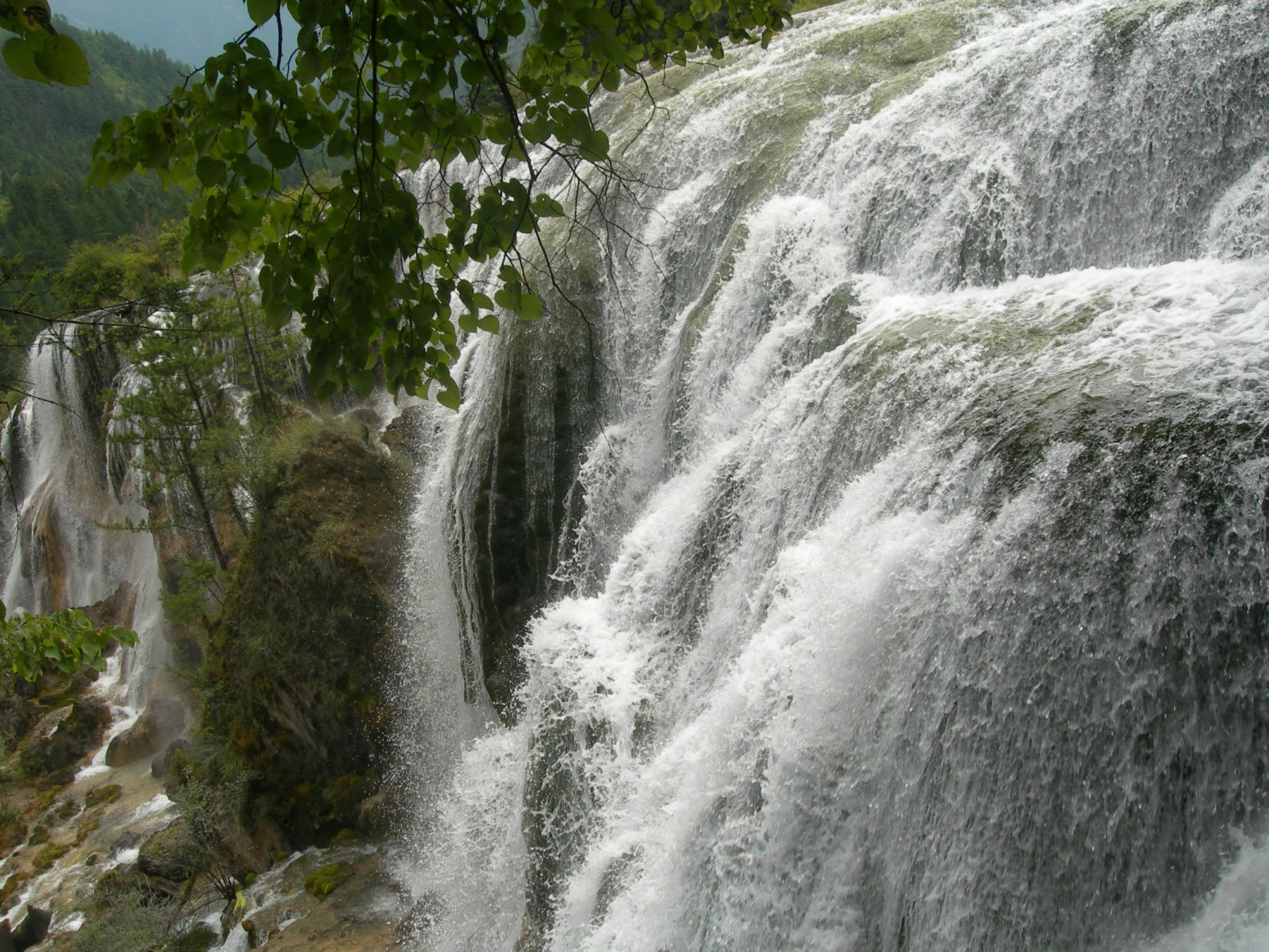 顺滩而下的流水形成九寨沟最大的钙华瀑布——珍珠滩瀑布宽200米,落差最大可达40米,如银河天降,气势磅礴,在山谷中发出惊天动地的轰鸣声,气势非凡。宽阔的瀑布冲进谷底,咆哮如雷,卷出千堆浪花,在翠谷中涌起水雾,既而向东狂奔而去。水声雷动,山涧沸腾,气势磅礴。珍珠滩瀑布,,气势非凡,雄伟壮观。瀑布冲进谷底,吼声如雷,卷起千堆浪花,向东狂奔而去。这道激流水色碧绛泛白,是九寨沟所有激流中水色最美,水势最猛,水声最大的一段。激流左侧栈道,是观赏这一股碧玉狂流的最佳点。