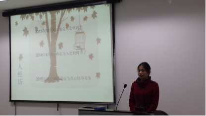 答辩开始后,每位重点培养对象按照次序上台,做5分钟左右的自我介绍,通过PPT向大家展示了自己的个人简介、入党动机、取得的奖项成就以及今后的发展方向等等。随后,进入问答环节,评委从党的基本知识、时事政治、对党的认识、个人发展规划等方面提出相关问题,同学就评委的提问逐一回答。台上同学的精彩展示赢得了在场学生的掌声。