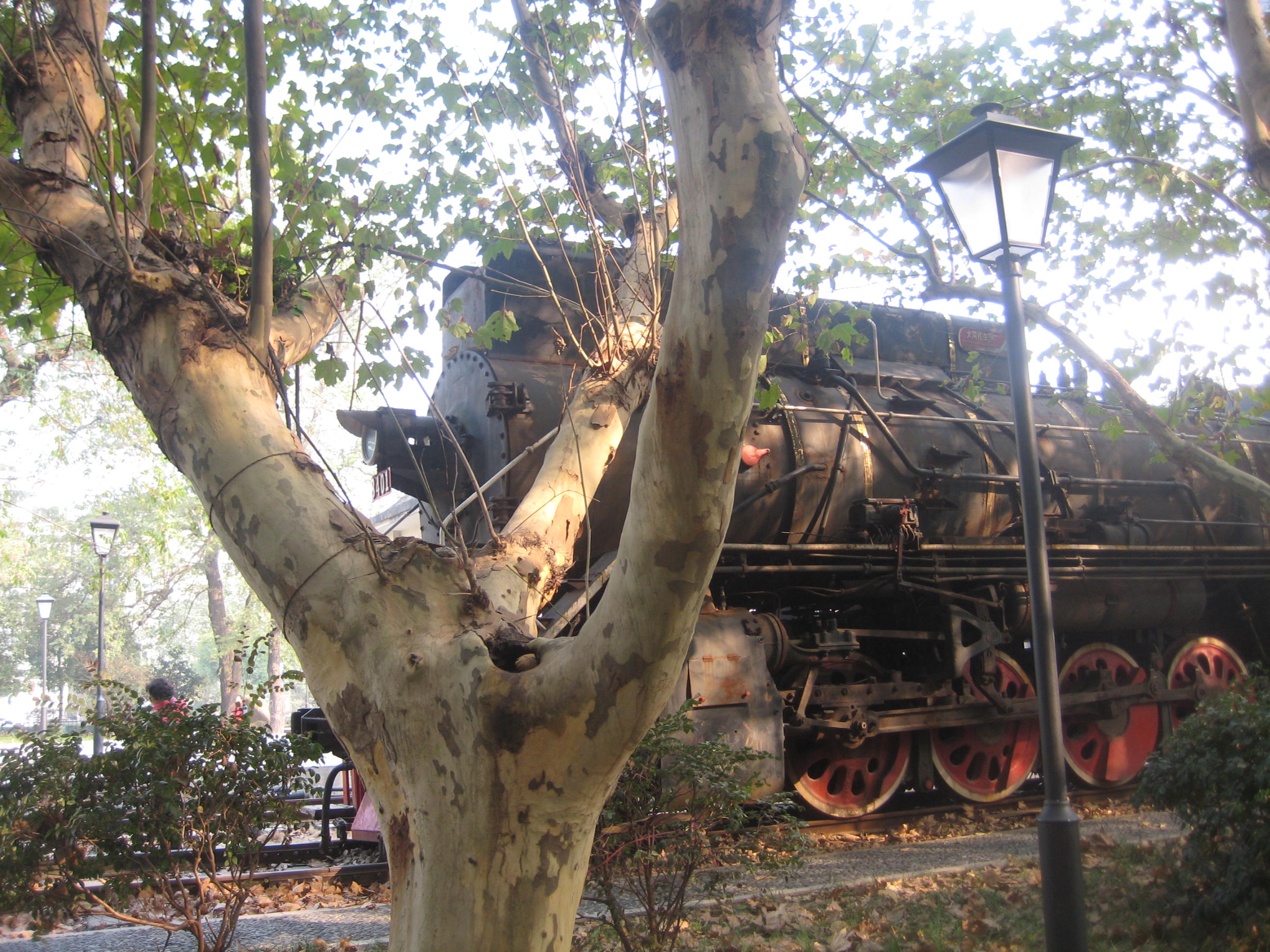 静静地躺卧在遗址公园梧桐树旁的蒸汽火车头。(王开阳摄)