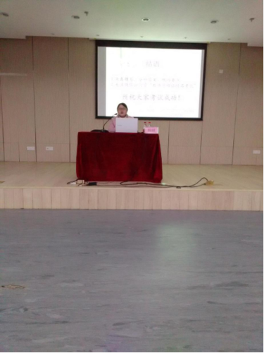 杨燚同学和申屠斯文同学先后上台为大家分享经验。杨燚同学主要向大家介绍了考试的科目和重点题型。她详细讲解了每个科目的大题,给大家介绍了一些答题方法和侧重点,例如作文题与教学设计等。