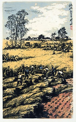 我很喜欢他的《秋收》。画作撷取乡间农民在盛夏开镰收割早稻的日常生活场景,以接近新鲜稻谷的浅黄色作为基调,构成严密的多层套色,铺陈丰富的色彩,所施布局,亦疏密有致,层次分明,“木味”尤其浓烈。