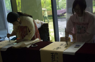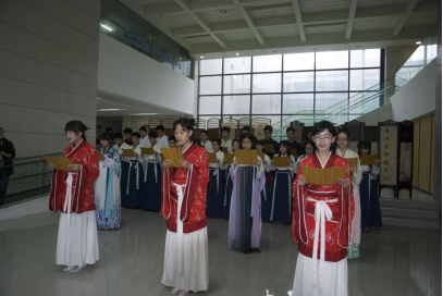 随着铿锵的鼓声和悠扬的伴奏共同响起的,是同学带来的第一首吟唱《诗经·郑风·子衿》。鼓乐飘飘,悠悠我心悠悠我思。吟唱中,间有同学们柔美的伴舞。伊人舞毕,采采蒹葭。紧接着是另一首吟唱《诗经·秦风·蒹葭》,所有同学轻举竹简,婉转的吟唱中诗韵非常。南橘深固,闭心自慎;取酒对酌,宁醉不醒,《九章·橘颂》的朗诵领在场同学感受到楚辞风韵。最后带来的是朗诵《将进酒》。同学们合掌顿足,明快的节奏中吟诵节目完美结束。
