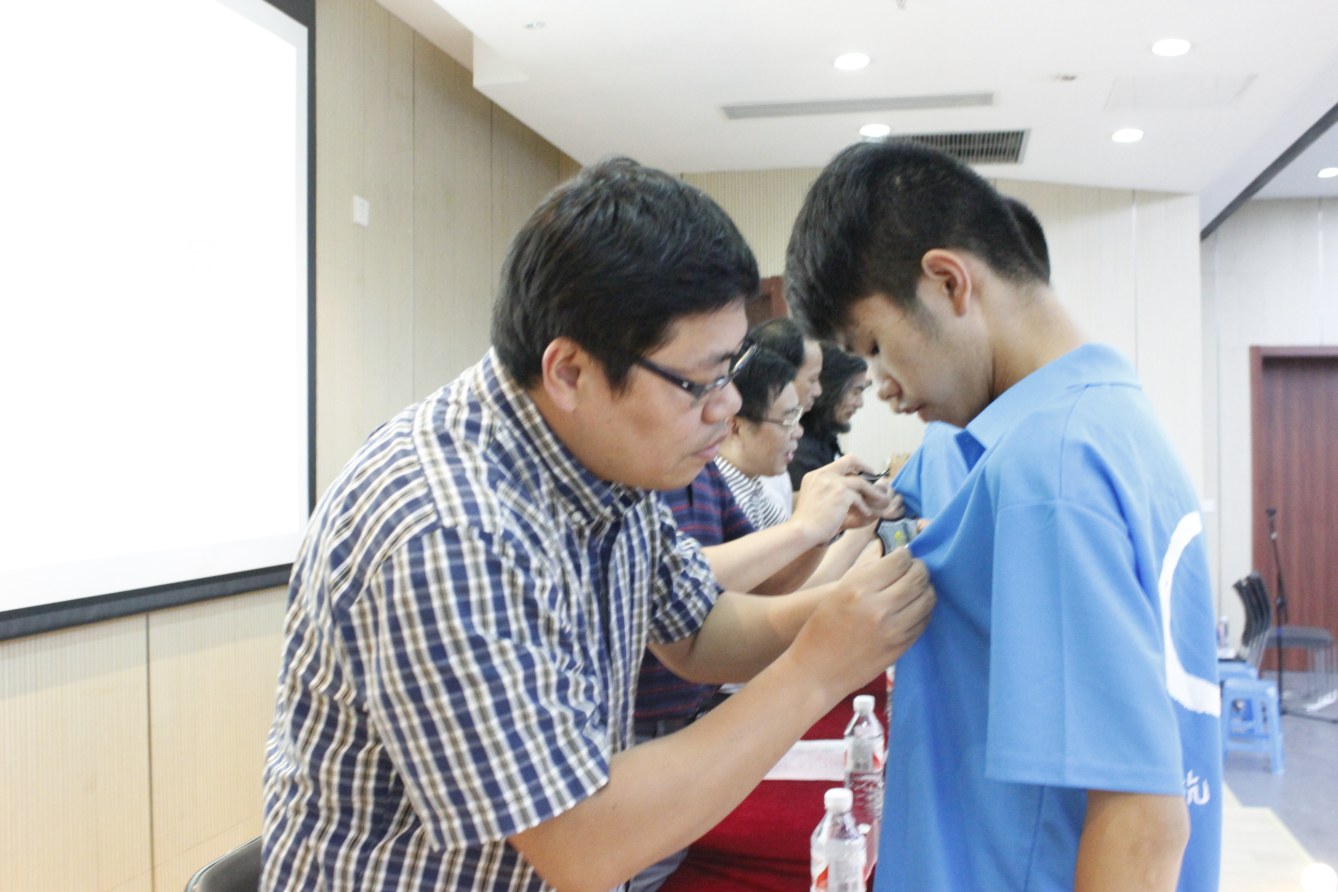 开学典礼上,学院领导班子和老师,为新生代表佩戴了院徽。