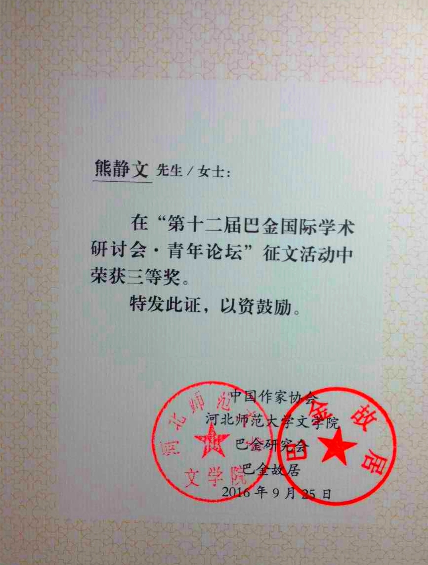 9月24日至25日,由中国作家协会、河北师范大学文学院、巴金研究会、巴金故居主办的第十二届巴金国际学术研讨会在河北师范大学举行,欧美色情 2015级现当代文学专业研究生熊静文的论文《“走”与“停”:论巴金小说中家庭观念的演变——以<家><憩园><寒夜>为例》在“青年论坛”中喜获三等奖。