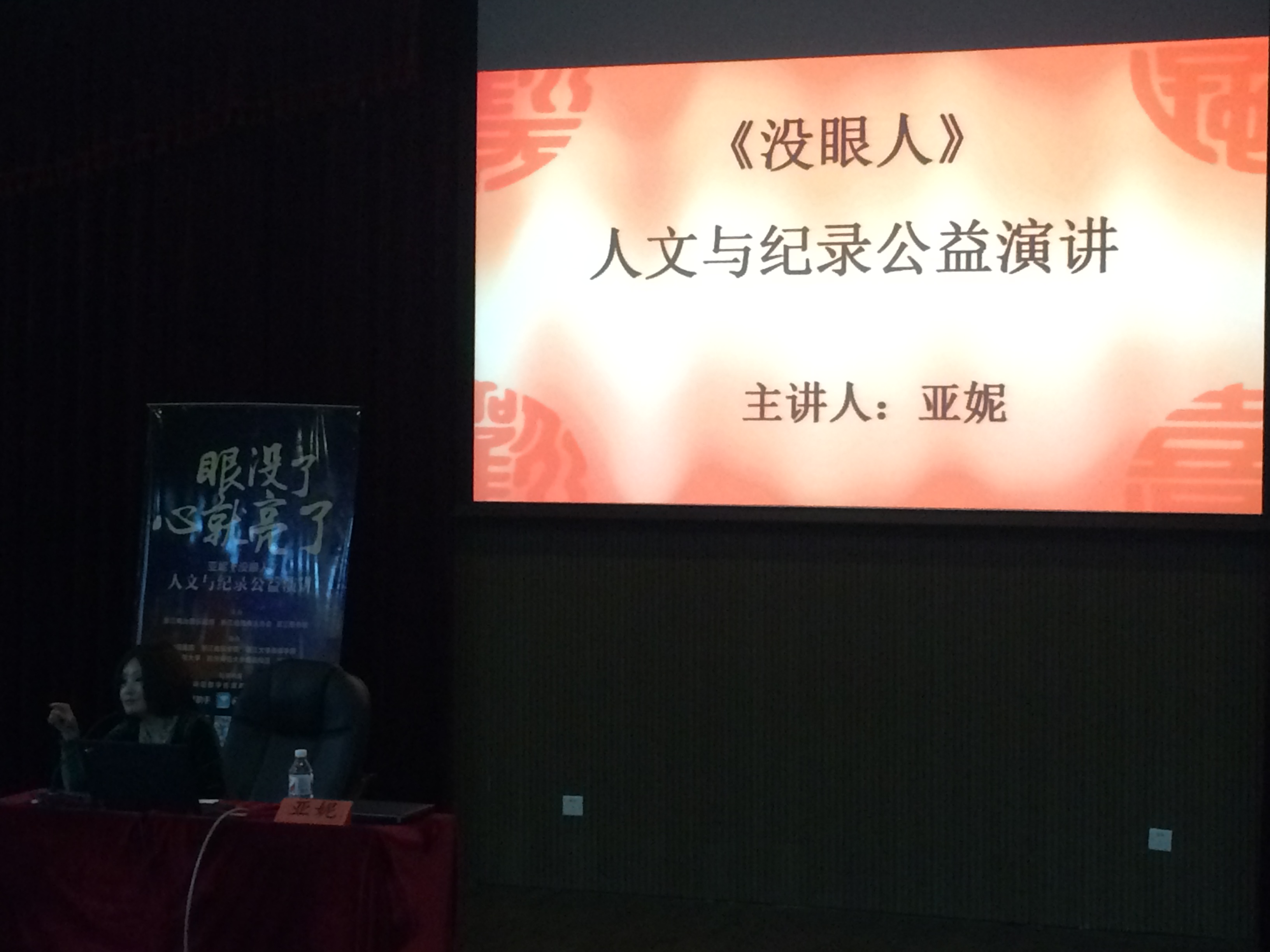 10月21日下午14点,由浙江电台音乐调频、浙江残疾人协会及浙江图书馆协会主办,欧美色情 承办的《没眼人》人文与纪录公益演讲之杭州师范大学专场,在恕园23号楼弘艺厅举行。集主持、编导、制片人于一身的全能型电视节目主持人亚妮是此次公益演讲的主讲人。