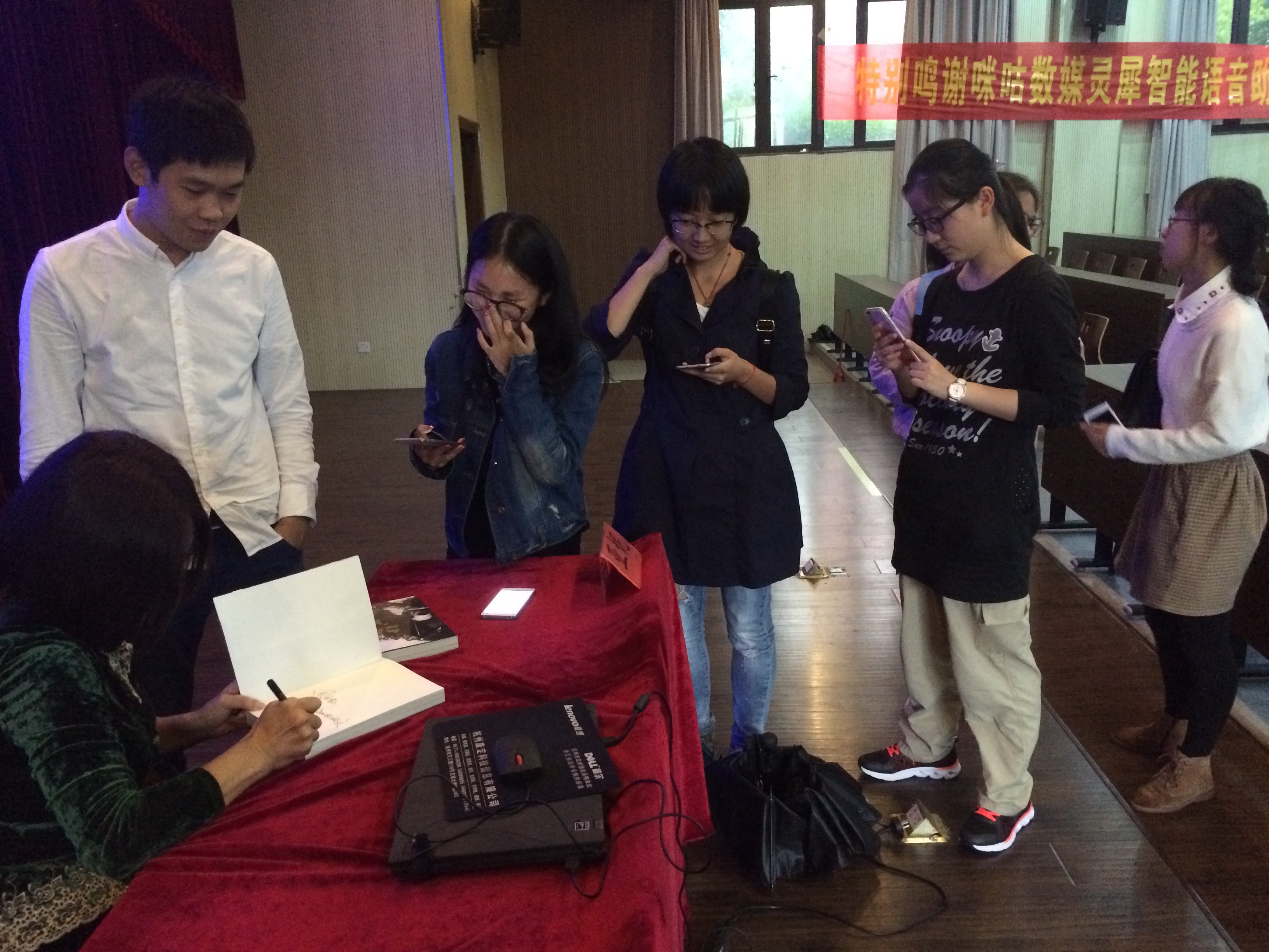 此后,亚妮老师将话题过渡到亲情在生命中的分量,向大家讲述了没眼人肉三(声译)和兄弟们走山卖唱供外甥读书的故事,让观众体会到了最明媚的心灵和最纯粹的亲情。除此之外,她还讲述了发生在没眼人中的爱情故事以及为写成苗族史诗倾尽毕生心血的伟人王安江的故事。这些故事不仅带来感动,也发人深思,同时值得每一个人细细咀嚼,久久回味。演讲进入尾声时,亚妮老师为大家播放了《没眼人》的宣传片并与全场观众进一步交流,真诚恳切地为每位提问的同学答疑。讲座后,不少现场观众因动人的故事而潸然泪下。