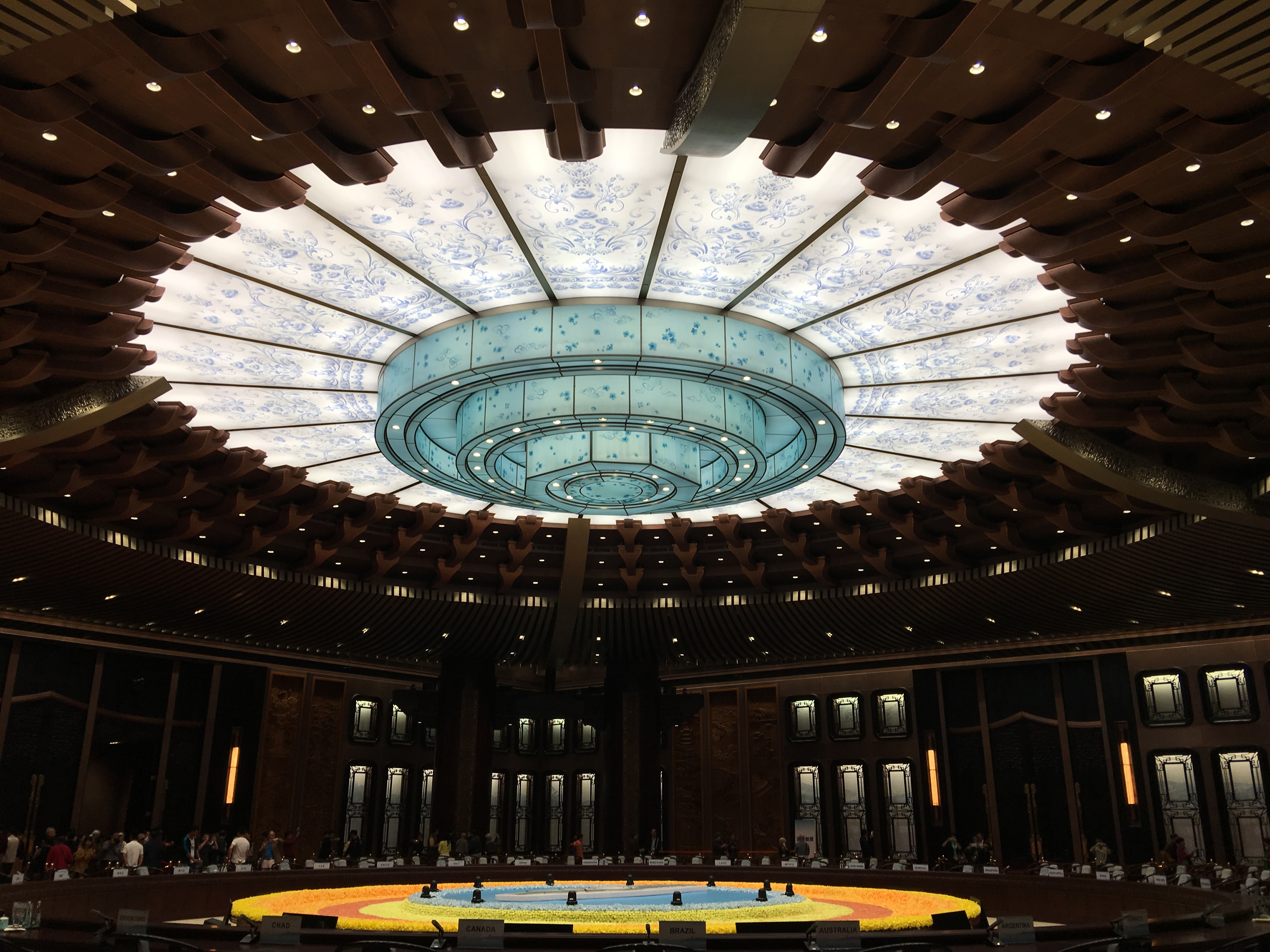 随后,大家来到了位于第四层的主会议室。会议室外方内圆的构造寓意天圆地方,内部的四梁八柱寓意四平八稳,渗透着中国的哲学思想。而穹顶的蓝色绢灯和流线型紫铜连心斗拱,环环相扣,代表着团结联动的强大力量。而100多斤重的红色木椅,四周江南镂空花窗式的墙面设计和“中华十二景”的木雕,都渗透着中国元素。