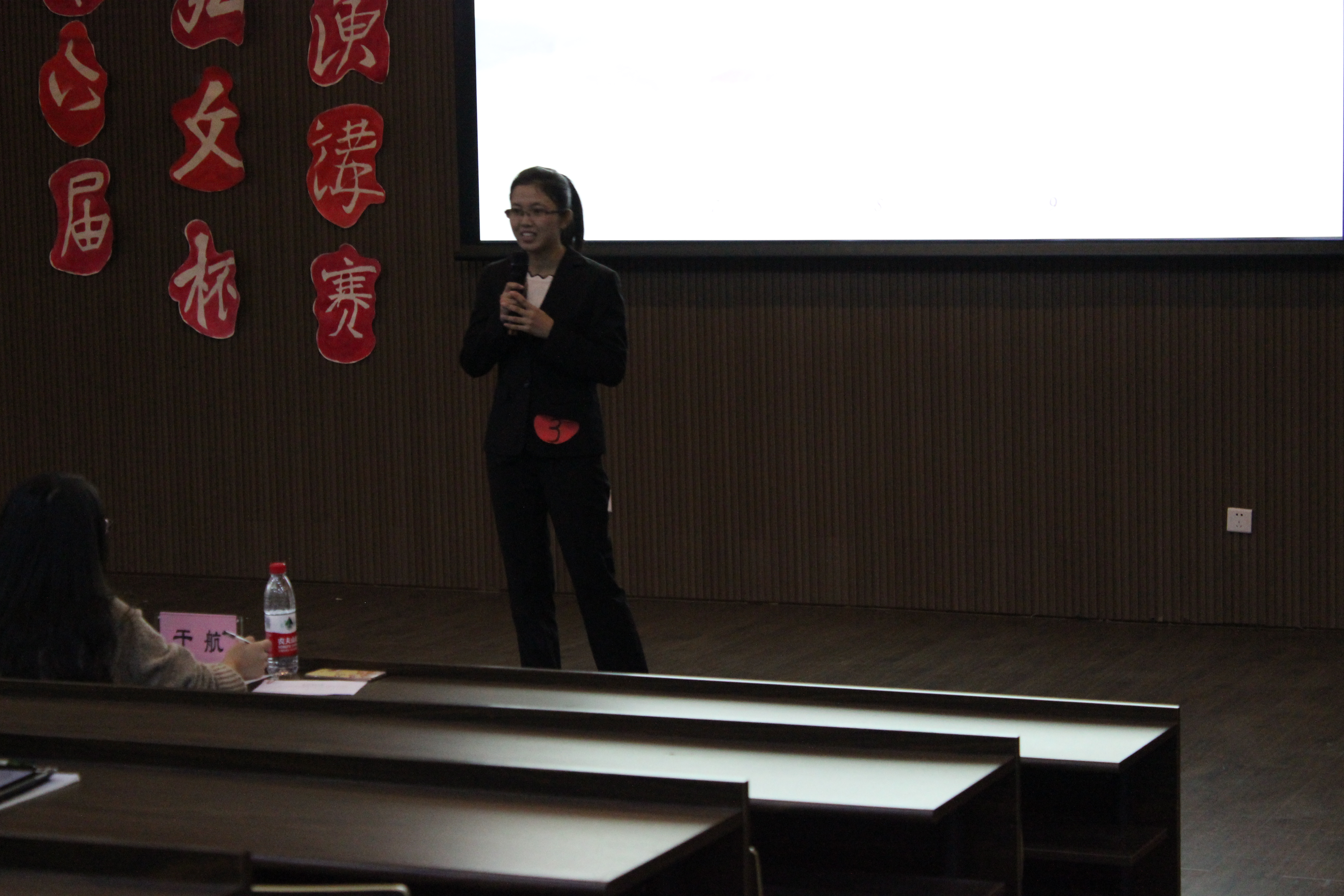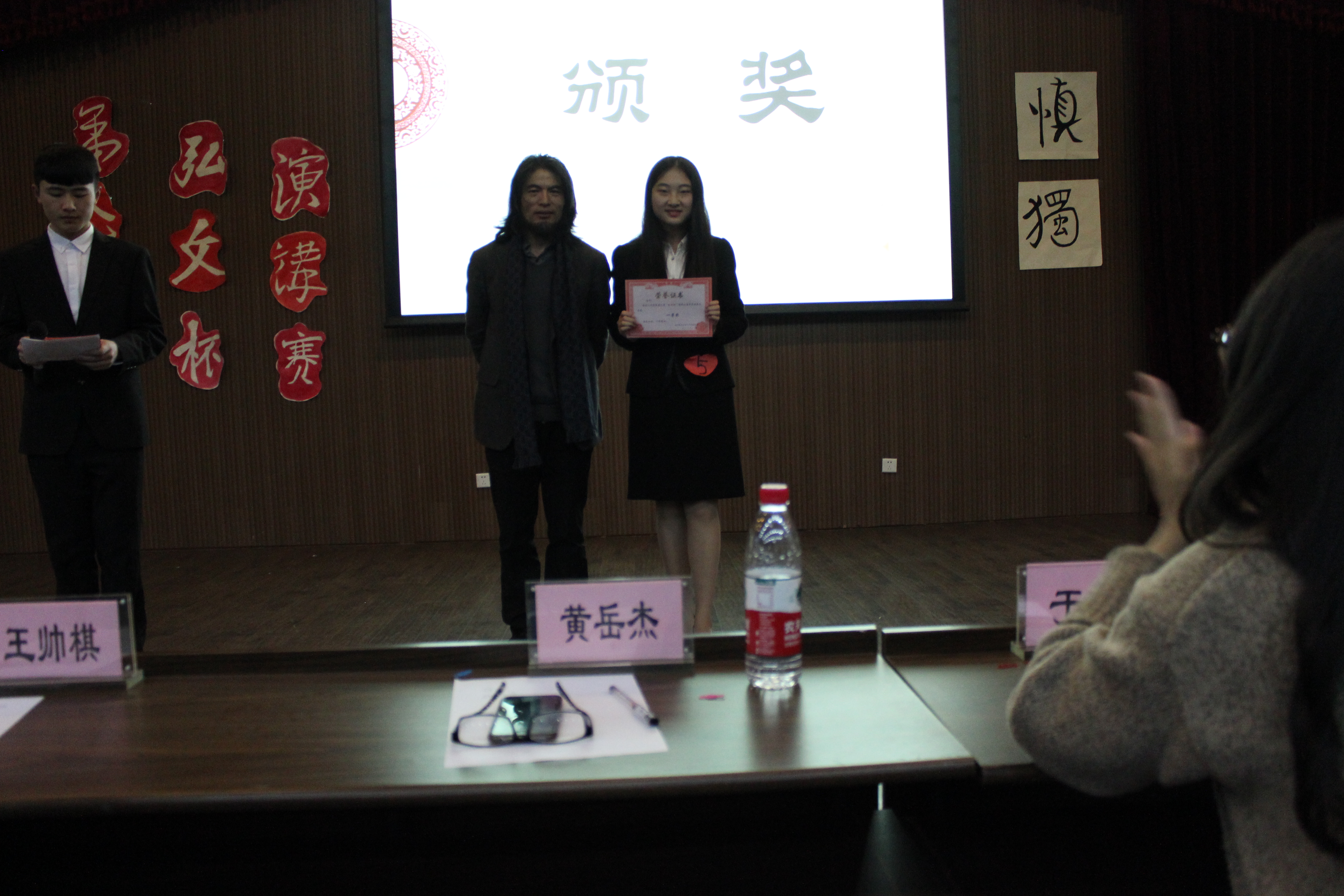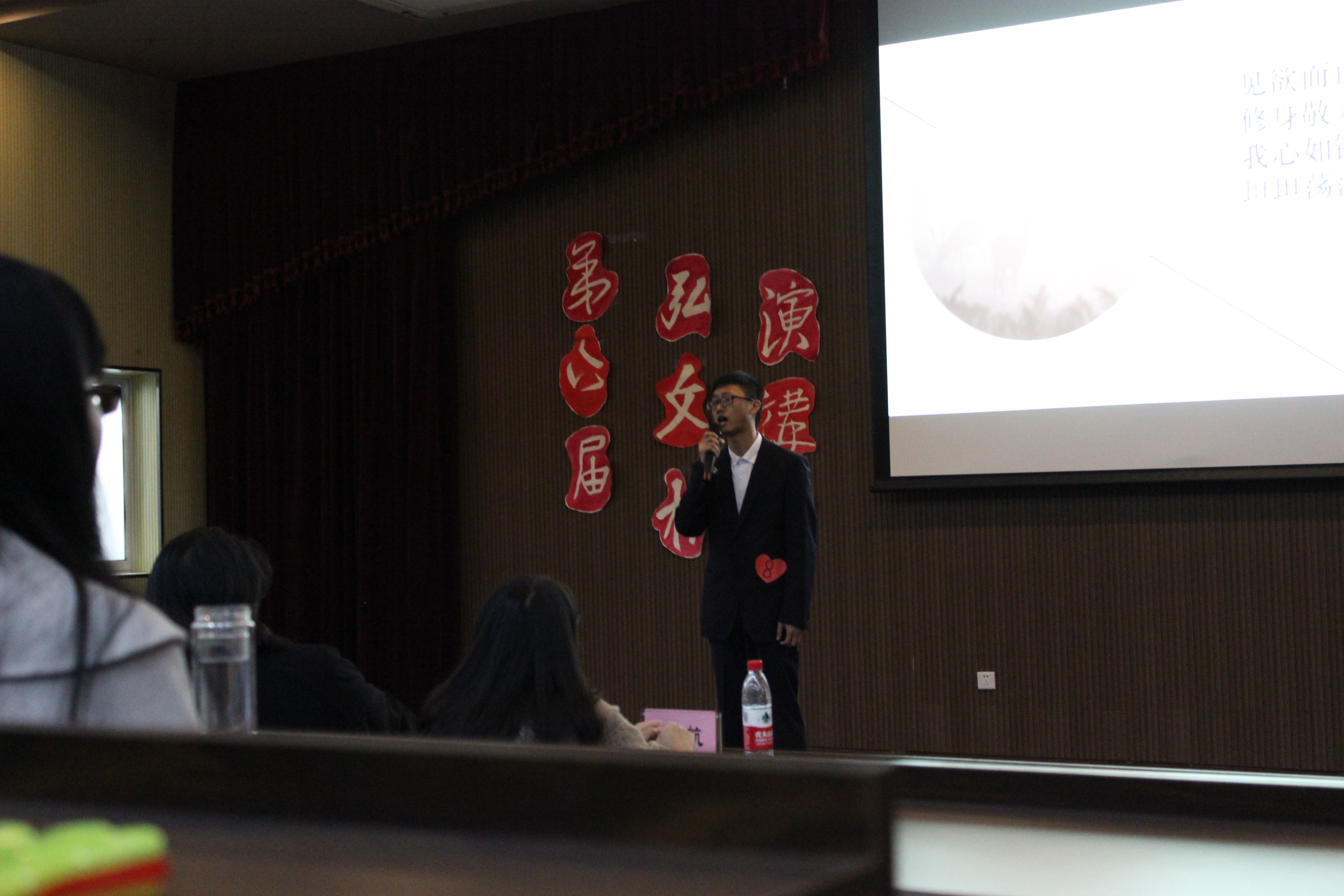 在评委点评环节,黄岳杰老师充分肯定了举办本次比赛的意义,他提出演讲者应该以一种交流的态度面对台下的观众,摒除机械式的背诵。同时,他还鼓励在场同学踊跃参与类似的活动,打破内心的壁垒,把握展现自我和提升个人素养的机会,加强文字渲染和口头表达的能力,用更好的方式和世界沟通。最后,来自中文152的姚庆华同学凭借出色的表现摘得本场比赛的桂冠。