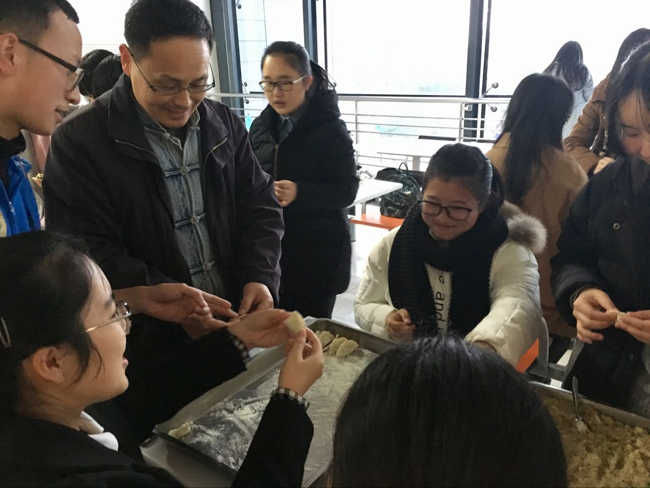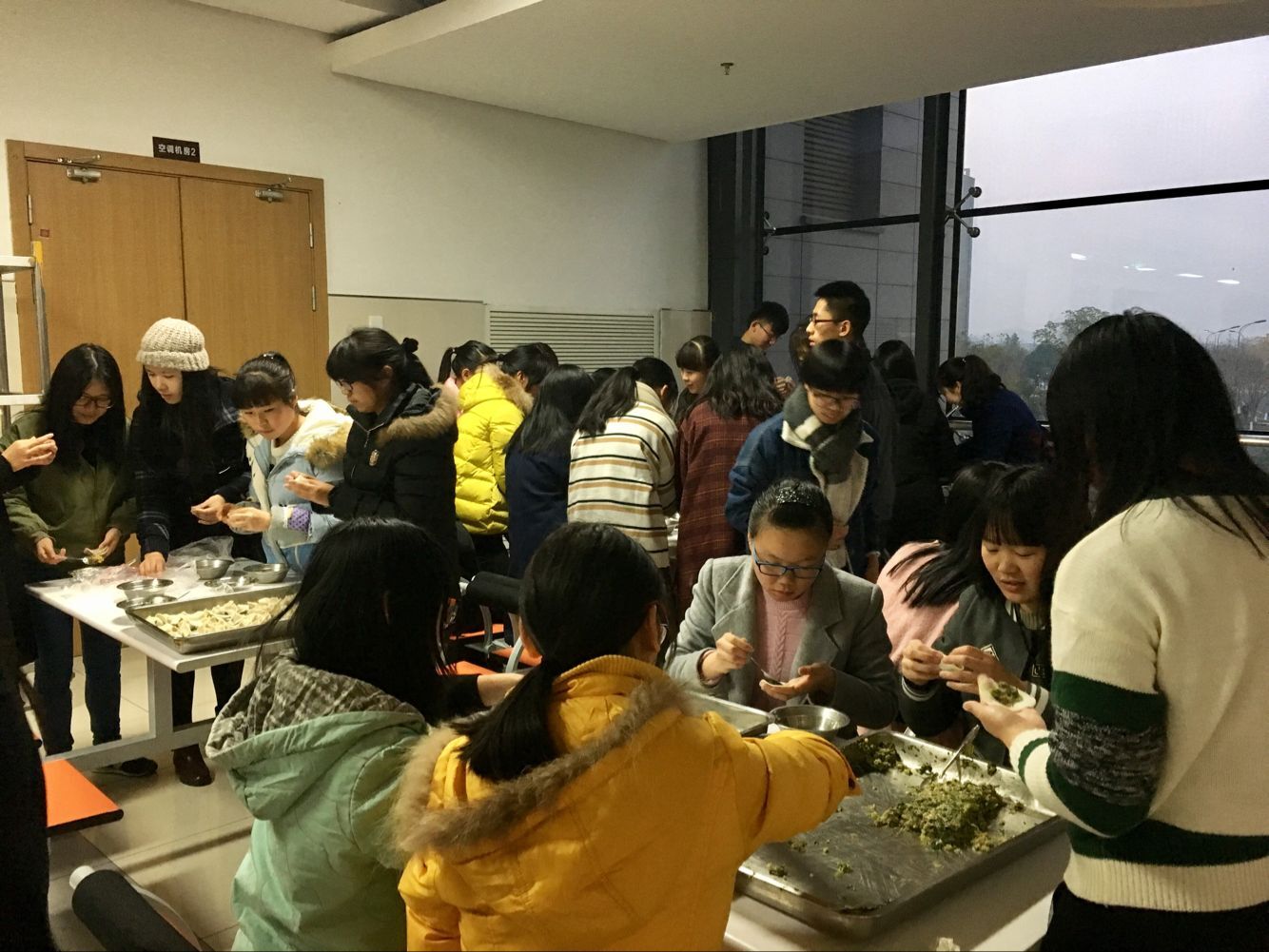 在活动开始之前,院勤工助学中心的干事部长们精心地准备好了包饺子所需要的各种素材,所以同学们一到便围着几张桌子开始紧锣密鼓的包饺子。同学们来自不同的班级,不同的地区,但此刻都成了一家人,开心地围在一起分享自己的包饺子方法。在同学们的盛情邀请下,原本在一旁“观战”进行理论指导的老师们也动手开始了“实战”。大家包的饺子形状各异,极具特色,整个过程中现场欢笑阵阵,热闹非凡。