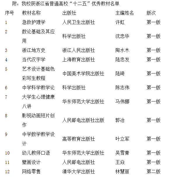 近日,浙江省高等教育学会公布了《关于公布浙江省普通高校“十二五”优秀教材评选结果的通知》(浙高教学会[2017]5号),经浙江省教育厅高教处和省高教学会教材专委会组织相关的教学指导委员会专家评审,共评出509部(套)优秀教材,其中本科教材327部(套),高职高专教材182部(套)。