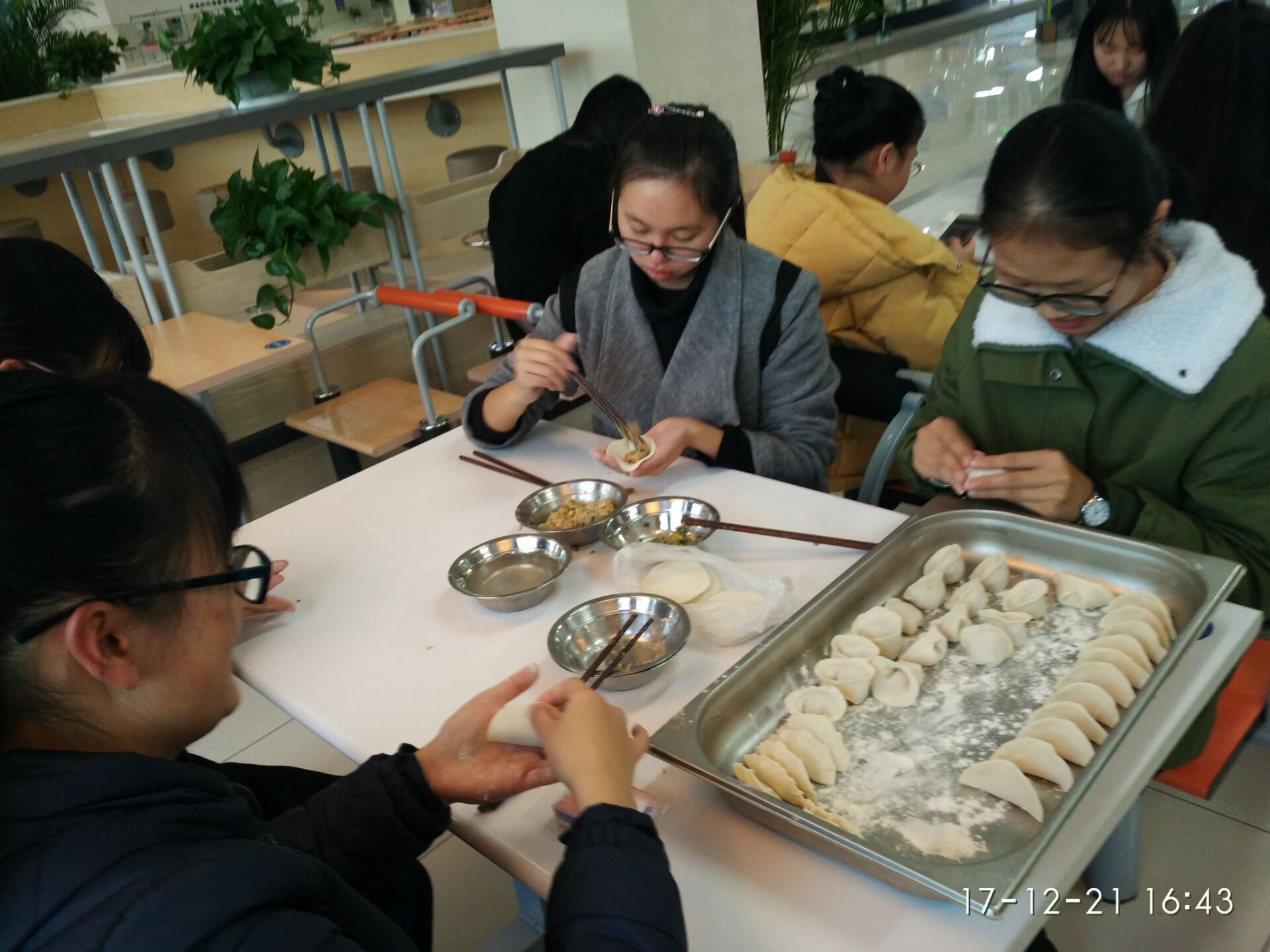 包完的饺子马上送到了食堂工作人员那里,片刻过后热腾腾的饺子呈现在大家面前。同学们有序地就座,每个人都品尝到自己亲手做的饺子,脸上写满了着温馨的笑容。老师也与同学们围坐在一起交流在学校的学习生活感受,其乐融融。