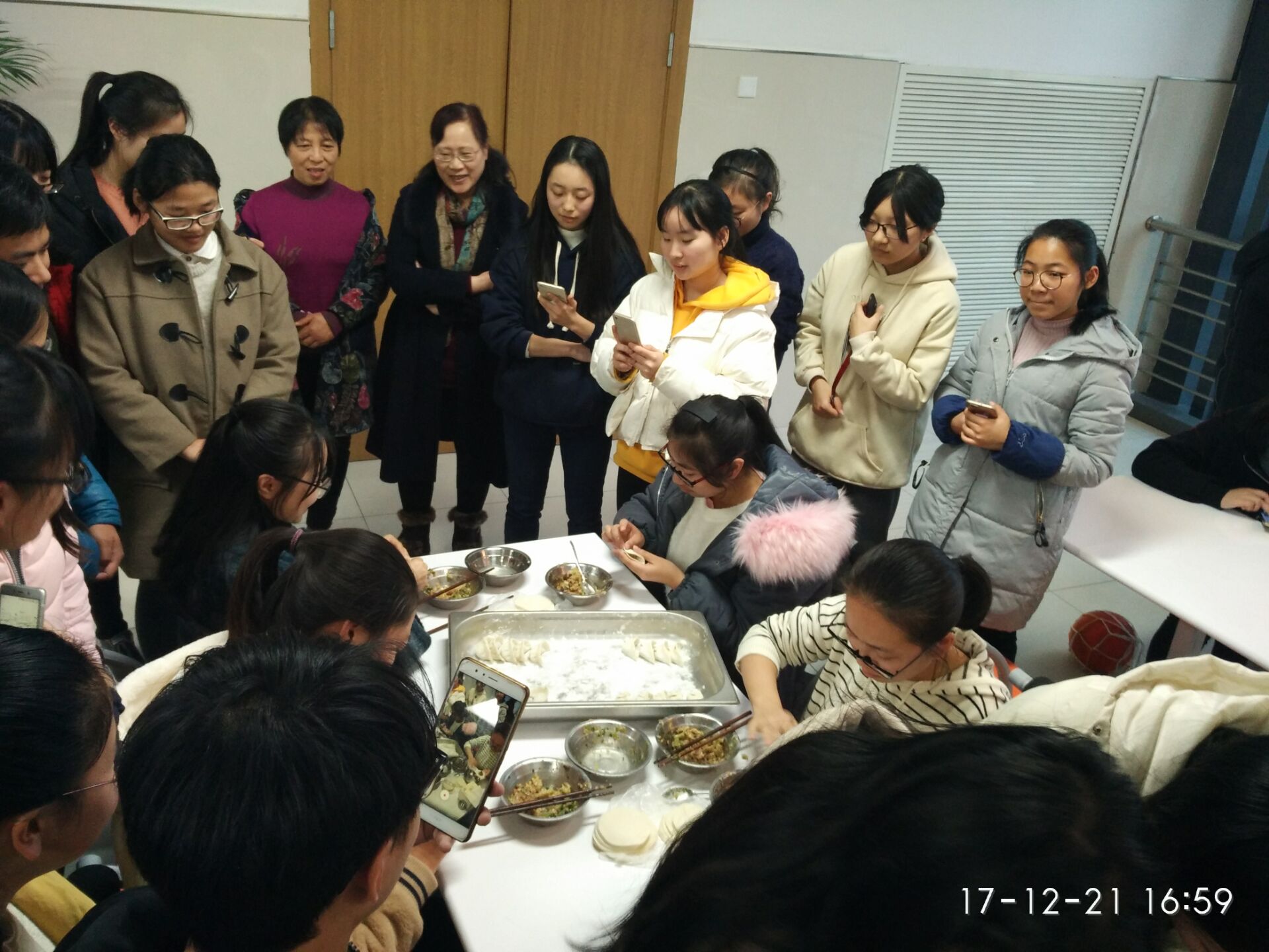 困难生“冬季送温暖”之包饺子活动在恕园8号楼食堂二楼举行。学院领导、老师同学生相聚一堂,向困难生们送去祝福,携手共同包饺子,迎冬至,贺新年。学院老师叶宏、沈志华、江素君、李俊洁,院党委副书记管庆江,辅导员傅培恩、陈晓玲、孔祥亮、陈航泽到场和全体困难生一起参加了活动。现场笑语连连,气氛融洽。