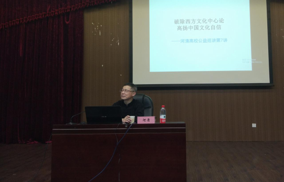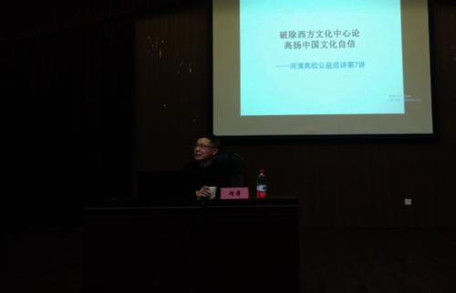 黄教授首先向大家分享了他早年的相关求学、工作经历,并由此引出了“破除西方文化中心论,高扬中国文化自信”的主题。随后,黄教授就“西方虚构历史,美化自己”、“西方文化中心论对中国文化三重否定”、“破除对西方文化的迷信”三方面展开论述。他结合具体的例子,对西方“民主”、“人权”、“自由”等概念进行了深层次的剖析,使大家充分地认识到“西方的民主制并不是像他们宣扬的那般,多党制其实与民主风马牛不相及”。接着,黄教授向大家分享了他对于树立文化自信方面的理解,他认为,树立文化自信的核心在于破除西方文化中心论和本民族的文化自卑。在观众互动环节,现场同学就“东西方的界定”、“对西方自由的理解”、“如何将精英艺术变成大众艺术”、“教师在促进中西文化交流方面应怎么做”等问题向河清教授请教,河清教授一一为大家解答,现场讨论交流气氛十分热烈。