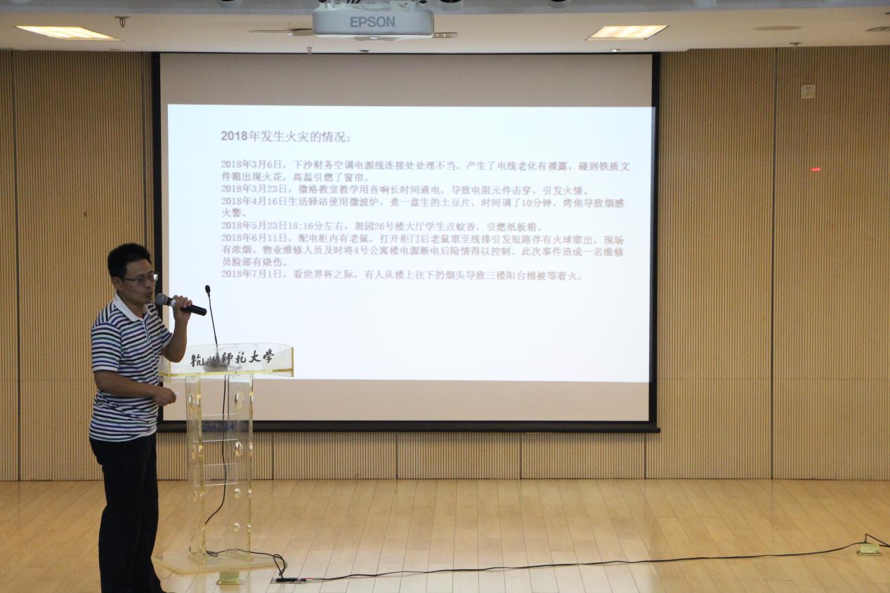 王伟老师从消防安全、政保安全、交通安全、治安防范四个方面向新生讲解了目前比较常见的各类校园隐患,并普及了相关预防措施。在消防安全方面,王老师以近年来杭州发生的火灾、爆炸事故为例向同学们强调消防安全的重要性,提醒同学们重视防火防潮,自觉维护消防安全。在政保安全方面,王老师指明了邪教、非法宗教活动的危害,强调言论自由需把握方向,嘱咐同学们擦亮眼睛,远离邪教、抵制非法宗教活动,并主动维护国家名誉、保守国家机密。在交通安全方面,王老师希望同学们“学会走路”、“学会骑车”、“学会打车”,遵守交通法律法规,保护好自己的人身安全。在治安防范方面,王老师希望同学们远离黄赌毒和层出不穷的网络骗局,注意识别各种常见的诈骗手段,提高警惕心理。