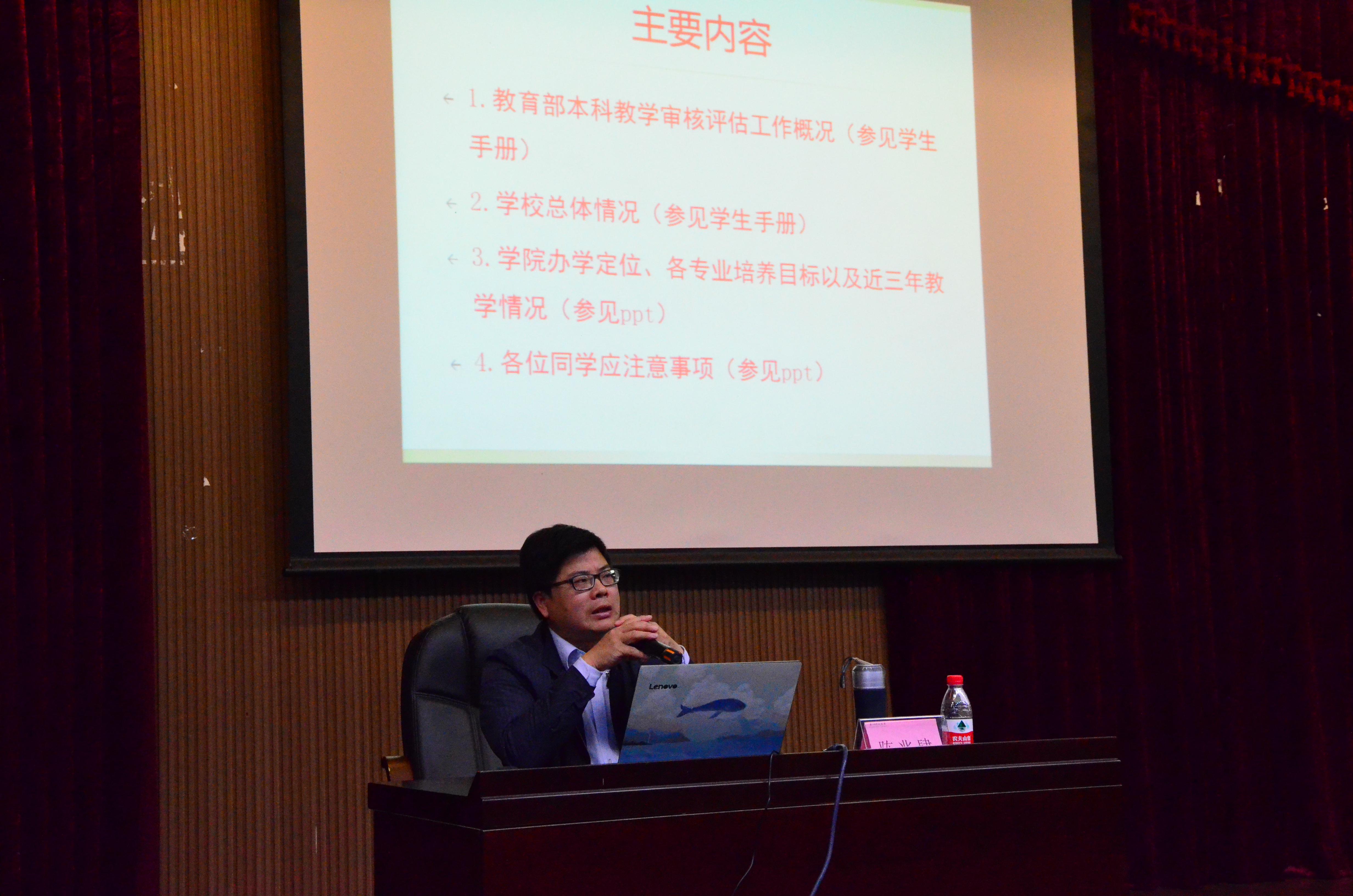 陈兆肆老师主要从本科教学评估工作概况、校情和院情三方面介绍了教学评估。陈老师指出,本科教学评估坚持“以评促建,以评促改,以评促管,评建结合,重在建设”的指导方针和“一坚持,二突出,三强化”的指导思想,在教学评估中,学校坚持“对国家负责,为学校服务”的工作理念和“以学校为主体,以学生发展为本位”的评估理念,此外,陈老师从审核评估的定义、意义、特征、理念等多个方面强调了该评估工作的重要性。此后,陈老师具体介绍了学校“勤慎诚恕,博雅精进”的校训、“建设特色鲜明的一流综合性大学”的办学定位和以及学校的人才培养目标、办学规模、师资力量和各硬件条件。最后,陈老师介绍了我院的办学定位、各专业培养目标以及近三年的教学情况。他号召人文学子要文明行为,礼仪待人,遵守纪律,体现人文学子的素养。