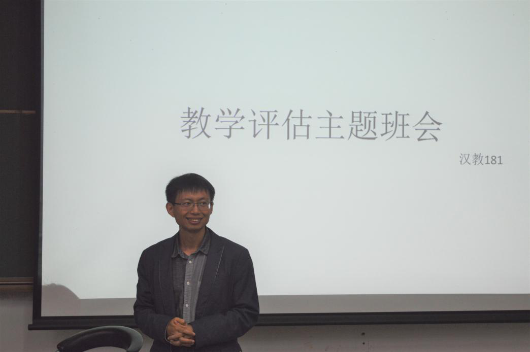 班会进行了第二步,带有一丝丝羞涩的班主任进行了讲话。他向我们介绍了什么是教学评估以及我们应该如何对待此次的评估。作为一名大学生,我们要做的是广博的学习,阅读更多的书籍,上课严肃认真听讲,积极参与课堂讨论,并认真的完成老师课外的活动和练习。尊重每一位老师,团结友爱每一位同学,充分发扬自己的特长。