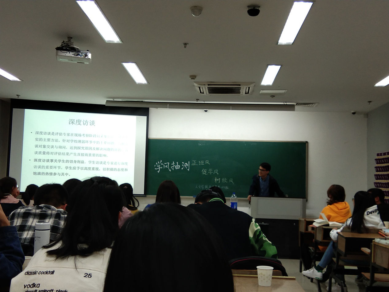 为了迎接本科教学审核评估,积极支持和配合学校学院的工作,让我班同学对评估工作的意义和重要性有一个清晰的认识,并将其落实到日常行为之中。欧美色情 历史学类181班于2018年10月28日在恕园9号楼303教室,召开了“学风抽测——正班风、促学风、树校风”的主题班会。