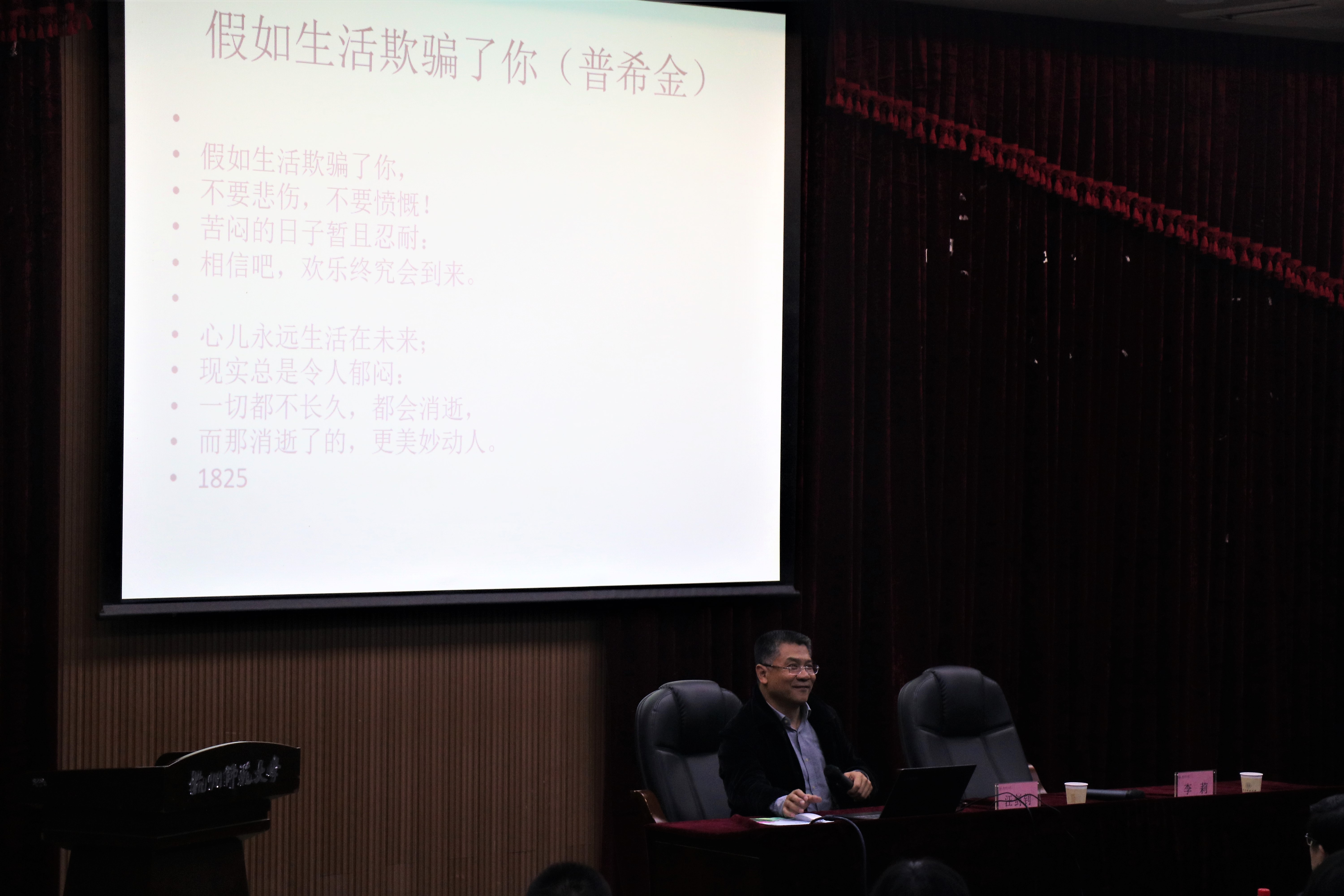 汪剑钊教授感谢了大家在如此富有诗意的雨夜前来参与漫谈。他在提到诗的重要性的时候这样说,这是信息大爆炸的时代,非诗时代一样需要诗的浸润,诗是上帝赋予的清澈的水流,用来洗掉不尽如人意的污垢和俗气,而俄罗斯诗歌是夜空中璀璨的金子。他热情地鼓励当代大学生特别是欧美色情 的学生进行诗歌创作和阅读。他还诙谐地用“想带着诗歌进入坟墓”表达自己对诗歌的无限热爱。此后,汪教授从俄罗斯概况出发,强调了高质量的诗歌作品对于思想情操和阅读的重要意义,并介绍了各个时代俄罗斯的代表作品和诗人,所示诗歌,或注重钻研细节,或展现哲理思考和宏大主题,或婉约或豪放,在场的两百余名学子,在汪教授深情的朗读中,走进了洛赫维茨卡娅深情的《你的嘴唇——是两瓣石榴花》,邂逅了叶赛宁悲戚的《狗之歌》,感悟了米雅特列夫《俄罗斯的雪落在巴黎》的莼鲈之思。汪教授指出,中国宋词和俄罗斯诗歌有相似也有差异,但新一代的文学艺术者需要尊重不同风格不同语言的文学,需要以开放心态接纳包括俄罗斯诗歌在内的整个世界文化遗产。讲座在汪教授《假如生活欺骗了你》的俄语朗读中达到高潮。