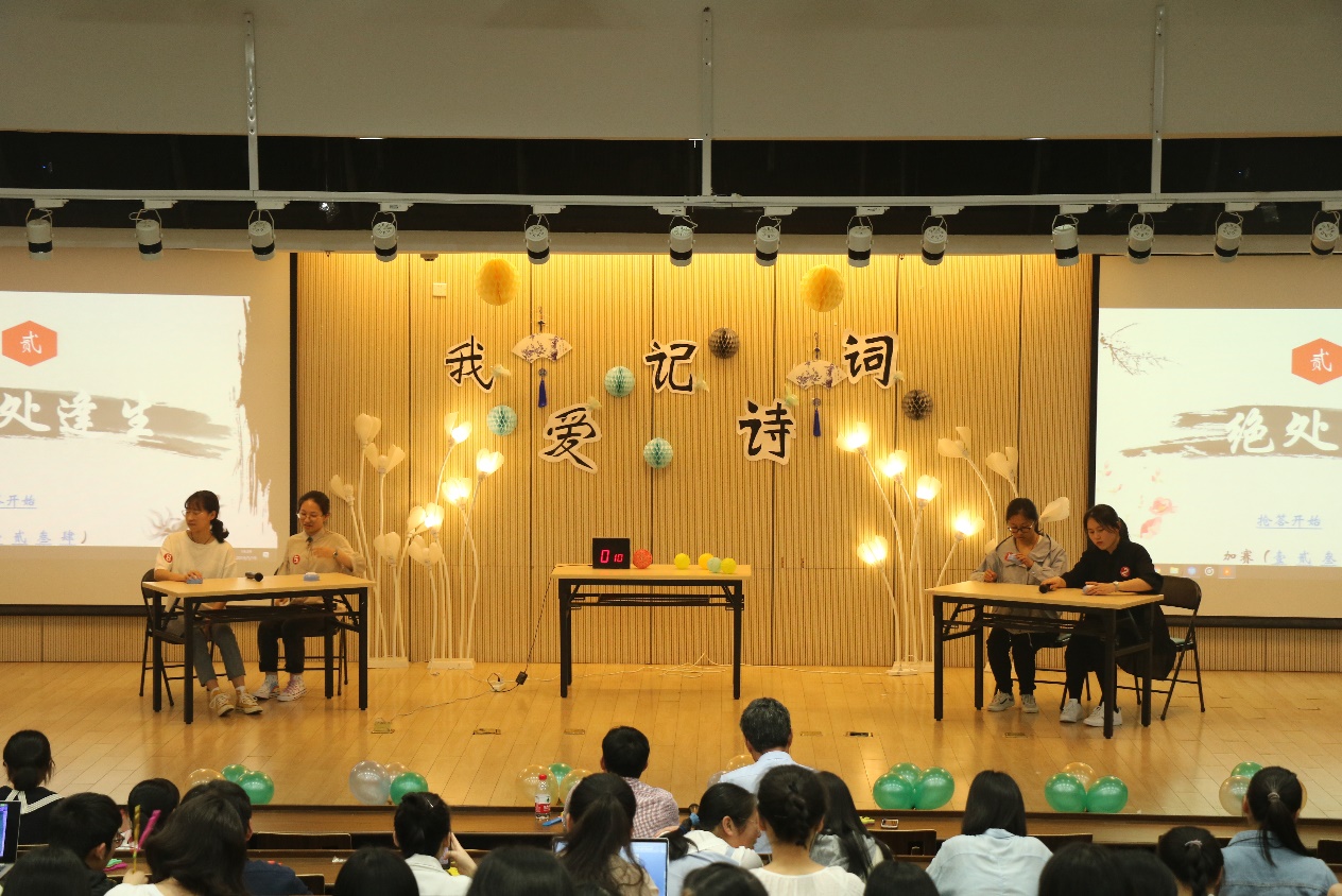 经过初赛笔试激烈的竞争选拔,来自我校各学院的24位选手脱颖而出,组成8支队伍进入决赛的角逐。在精彩的短片介绍后,比赛正式开始。决赛分为“狭路相逢”、“绝处逢生”、“谁与争锋”、“高步通衢”四个环节。在比赛中,各组选手才思敏捷,反应迅速,展现出其扎实的诗词功底与宽阔的知识视野。而“高步通衢”环节使全场比赛进入高潮,“少年游”队、“惊鸿一瞥”队和“希望答”队以抽签的顺序依次进行飞花令,选手们在台上紧张地答题,而台下观众不时地为选手们优异的表现而鼓掌赞叹,比赛现场气氛热烈。