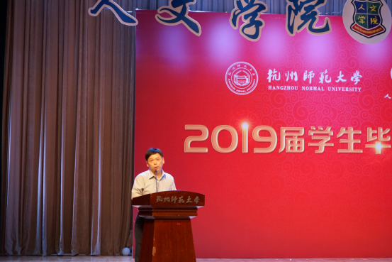 洪治纲代表学院向圆满完成学业的全体毕业生表示祝贺。他指出,告别总是感伤的,但人生总是在告别中走向新的世界。世界在你眼前,祝福在你身边。他分享了几个小故事,通过华为与美国的较量指出同学们要将眼光放高放远,让自己足够卓越,同时要具有非凡的胸怀去看待事情;通过华为启动备胎计划后各大技术人员的日夜奋斗,指出了中国人的血性、勇气与情怀,强调了人文学子应该具备情怀,不要向压力、困难低头,要像华为人一样,所有的困难都能唤起我们奋争的激情,所有的曲折都会变成我们的斗志。他以武侠小说家金庸的一句“人生就是大闹一场,然后抽身而去”真诚祝愿学子们不负青春、不负热血、不负情怀。同时他以《论扯淡》为例子,强调了追问的价值,要求同学们努力思考,只有在不断发掘思考,才能在逼近真理的道路上让人生闪耀耀眼的光芒。