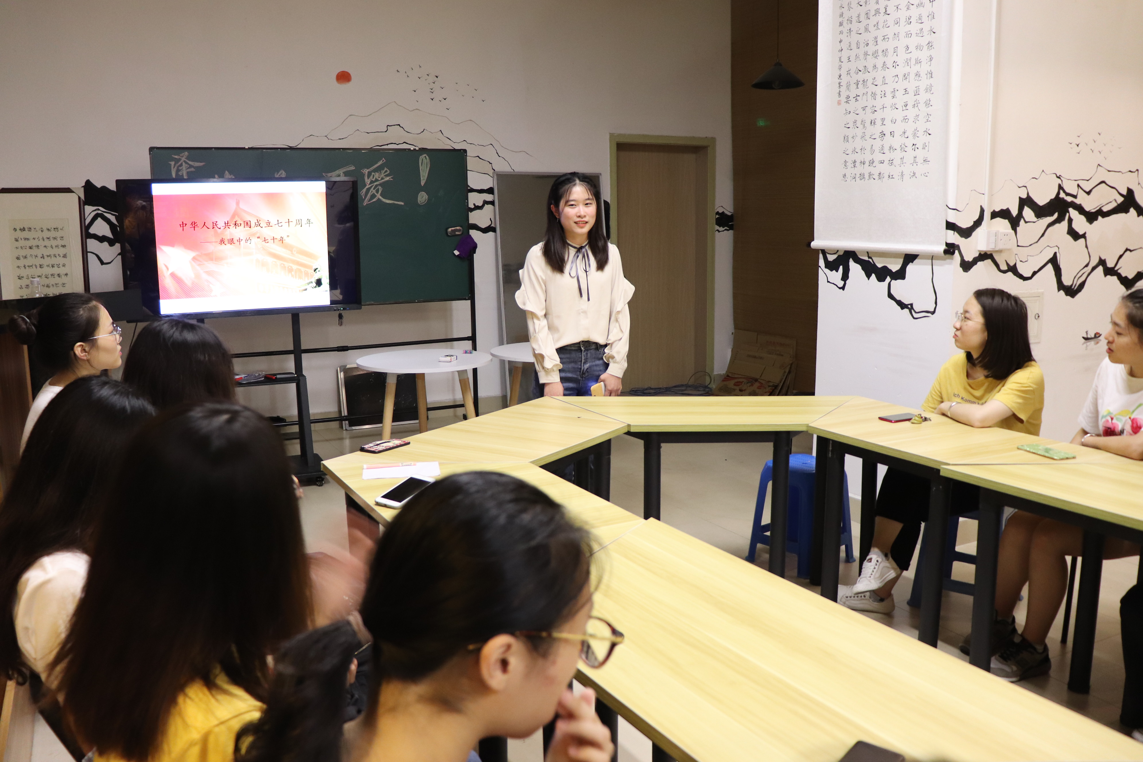 在观影之后,吴惠悦、任令如、雷雨欣三位同学结合自己暑期社会实践的经历,分享了在做建国七十周年家乡变化的考察时的感受,和大家分享了浙江仙居、浙江丽水的杨梅业、住房条件和经济发展的变化。伟大的七十年,给人民生活的方方面面带来了巨变,百姓的衣食住行随着社会经济的高速发展发生了翻天覆地的变化。听着三位同学的分享,同学们深刻地感受到了共和国的成长、民生的改善。