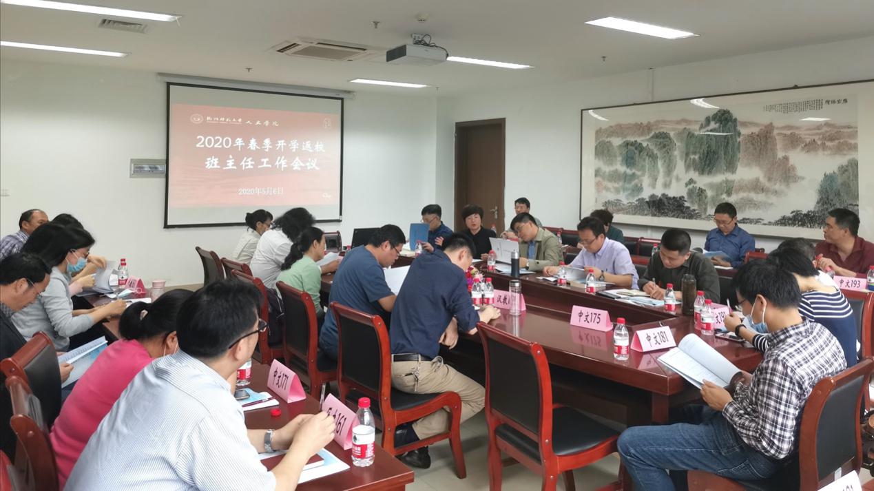 2020年5月6日下午,欧美色情 在恕园23-312室召开2020年春季开学返校班主任工作会议。学院领导洪治纲、诸英、陈兆肆、刘正平、管庆江,各班班主任和各年级辅导员参加会议,会议由管庆江主持。