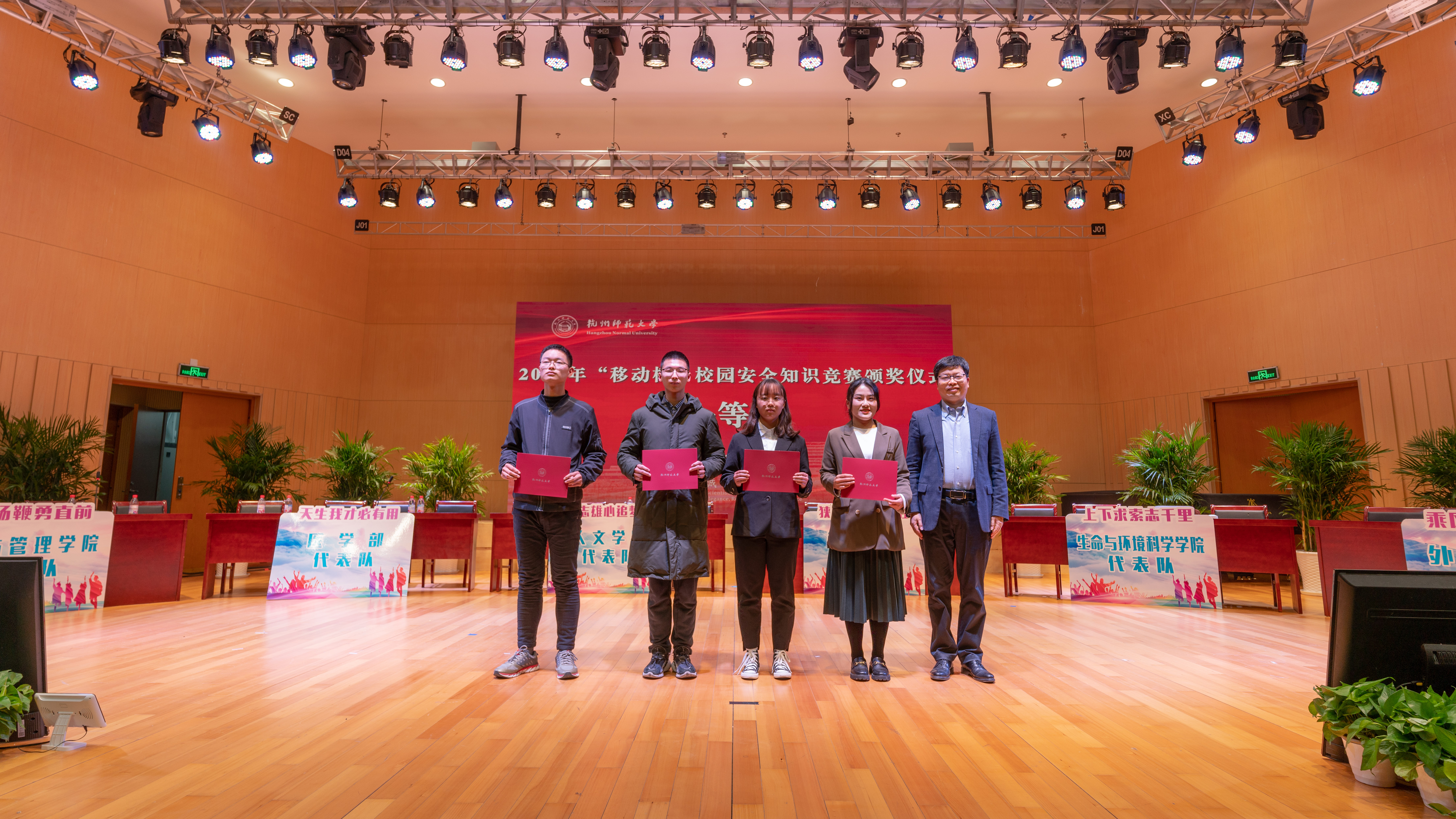 本次竞赛由学校保卫处、学生处、余杭区公安分局仓前派出所、中国移动杭州余杭分公司联合主办,校安全服务中心承办,从今年九月中旬启动,最终有六支队伍进入决赛。此次决赛分为必答题、抢答题和风险题三个环节,围绕防电信网络诈骗、消防、交通、治安、国家安全、政保等方面对学生的安全知识进行考察。