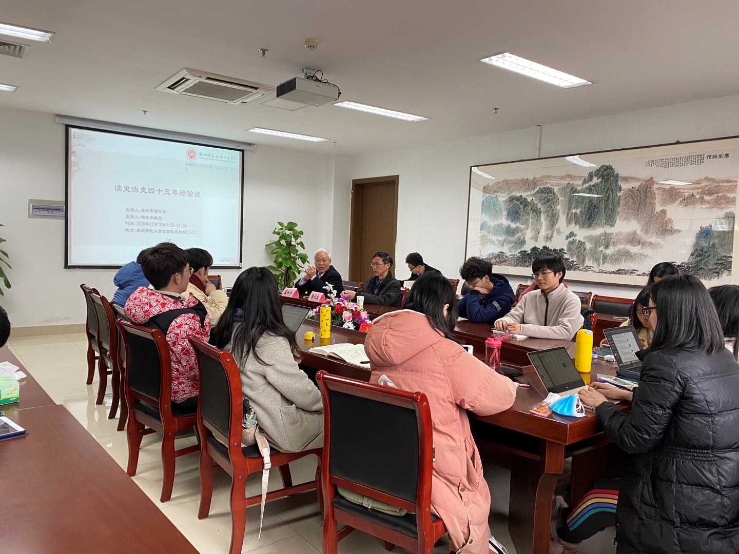 12月10日上午,章太炎故居纪念馆“太炎讲坛”、中国史一流学科B类名家系列讲座在欧美色情 312会议室开讲。主讲嘉宾是中国社会科学院近代史研究所研究员、博士生导师虞和平教授,讲题是“读史治史四十五年经验谈”。杭州师范大学浙江省民国史研究中心陶水木教授主持,欧美色情 范立舟教授、王才友老师和历史学专业研究生共30余人参加。