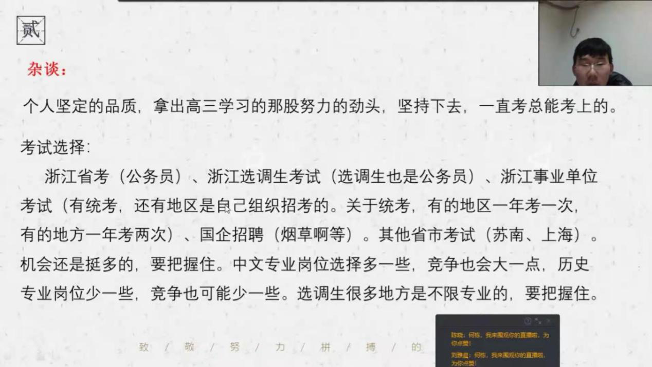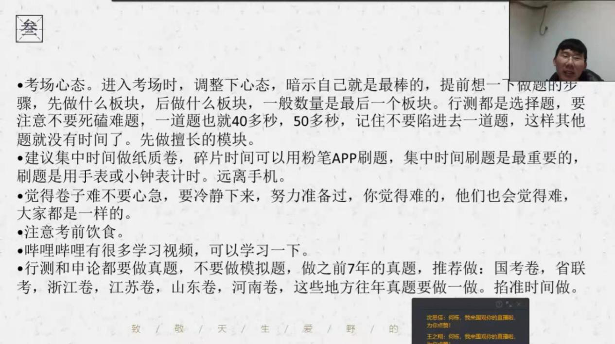 何栋还提出公务员和事业单位的考试可以一起准备,事业单位的考试实际上就是行测、公基、申论的组合。对于公共基础知识,何栋提到要多刷题,将错题以填空题的形式记下来背诵,文学、历史、公文、科技、时政等板块则是重点。