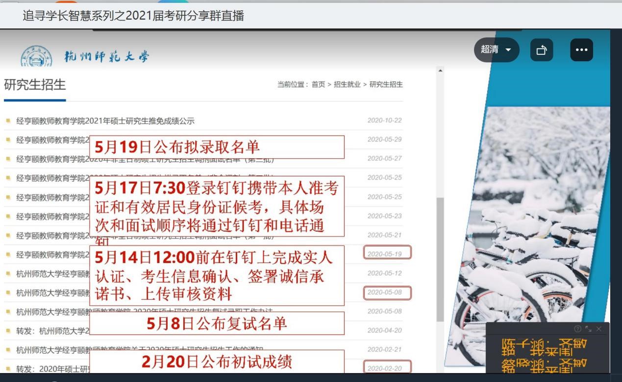 3月13日晚18:30,欧美色情 于钉钉直播平台举办了“追寻学长智慧”之2021届考研经验分享会。分享会邀请到了欧美色情 2020届校友杜诚艳、齐敏艳、张迎作为主讲嘉宾,为2021届考研本科毕业生带来了关于考研复试、调剂等相关知识和经验。分享会受到了全体考研的同学关注,也吸引了不少大三学生的参与。分享会由辅导员孔祥亮主持。