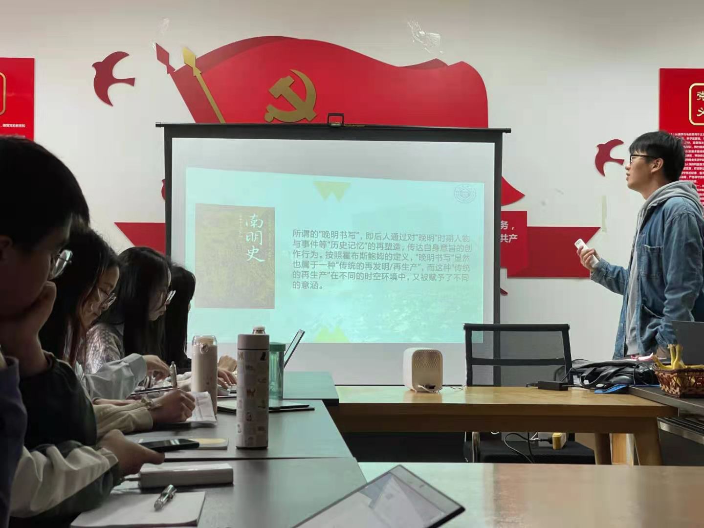 论坛分为两场,第一场由吕彦霖汇报,题目是“‘三百年悲壮史’——‘晚明书写’嬗变与士人心态转折”。吕彦霖从阿英与柳亚子对《杨娥传》的不同创作构想切入,分析“代际”文化心理所造成的两人在历史观和审美价值取向上的差异:阿英以人民史观考察南明史,在创作方法上忠实于历史的现实主义;而停留于传统英雄史观的柳亚子,表现出通过将历史传奇化、抒情化的创作倾向。
