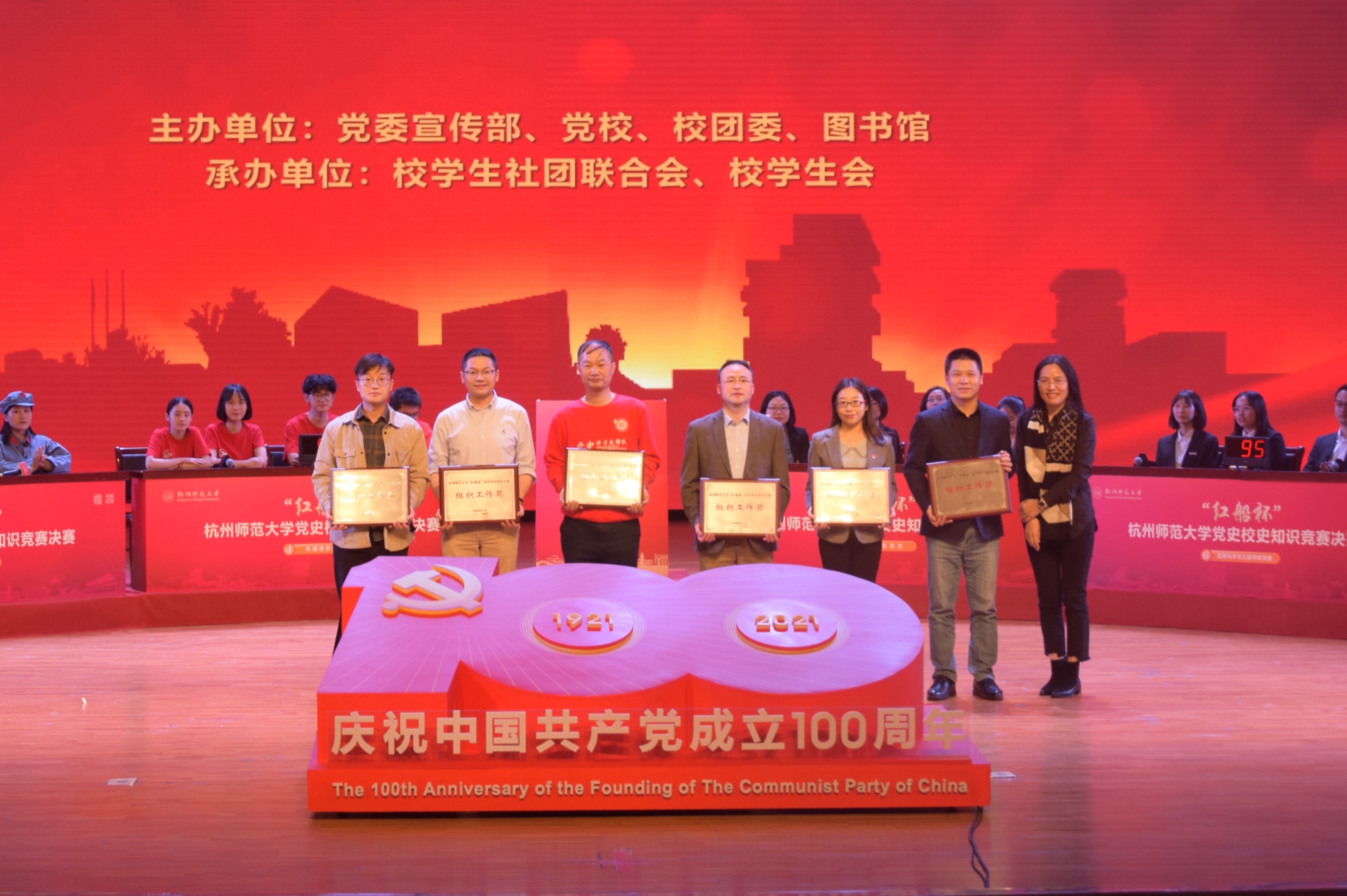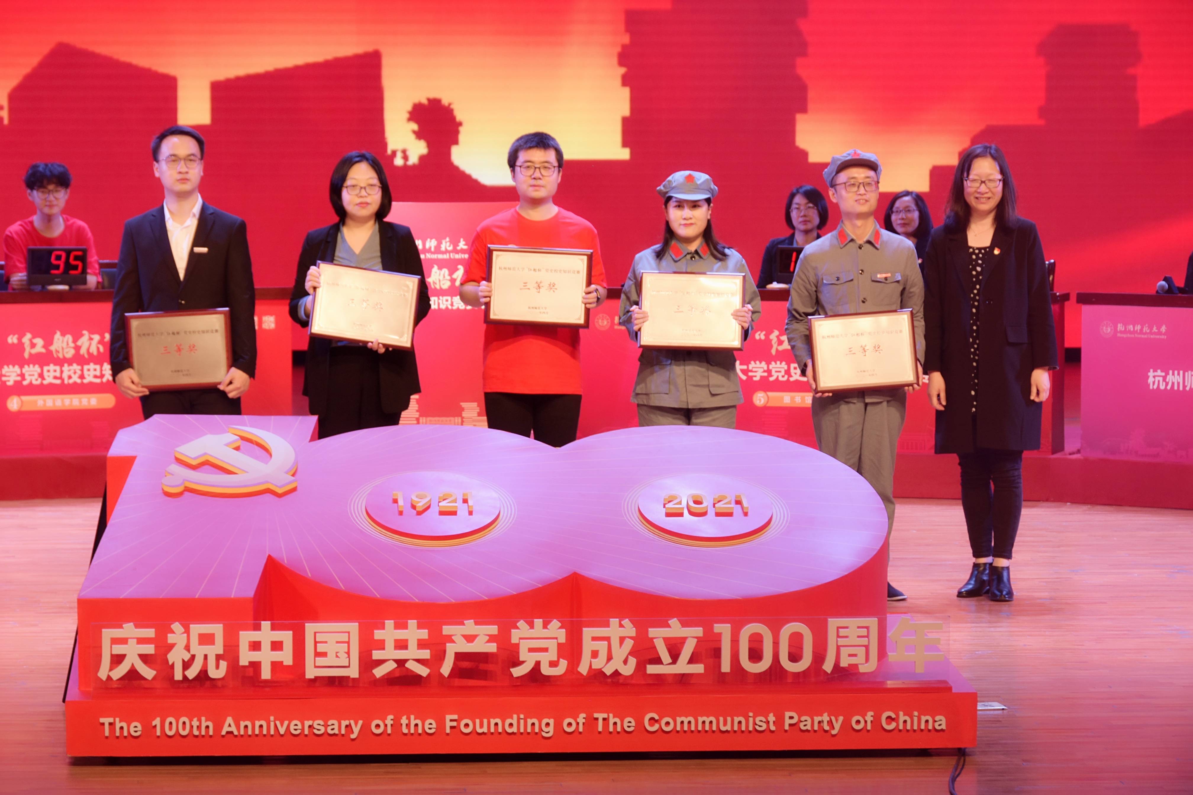 4月21日晚,我校于叔同剧场举办“红船杯”党史校史知识竞赛,欧美色情 代表队(队员:2020级辅导员李悦、中文181孙晴、历史192李懿怀、历史201余菀恬)经过与其他七支队伍的激烈角逐,斩获第四名,荣获三等奖。同时,在欧美色情 师生的共同努力下学院荣获“组织工作奖”。