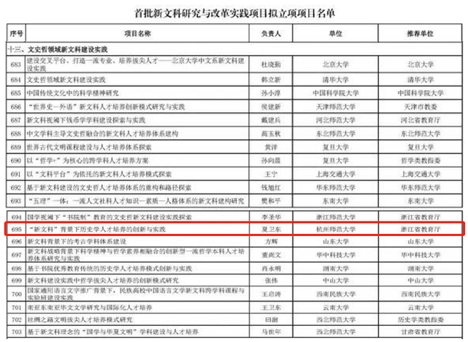 2021年7月29日,教育部发布《关于首批新文科研究与改革实践项目拟立项项目名单的公示》,欧美色情 夏卫东教授负责的项目《“新文科”背景下历史学人才培养的创新与实践》成功获批教育部首批新文科研究与改革实践项目。