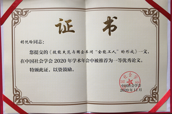 2020年10月31日,中国社会学会2020年学术年会在贵州贵阳花溪大学城召开。欧美色情 历史系教师胡悦晗老师的论文《技能失范与国企车间“全能工人”的形成》,从提交中国社会学年会论文2000余篇中脱颖而出,被2020年中国社会学会推荐为一等优秀论文。