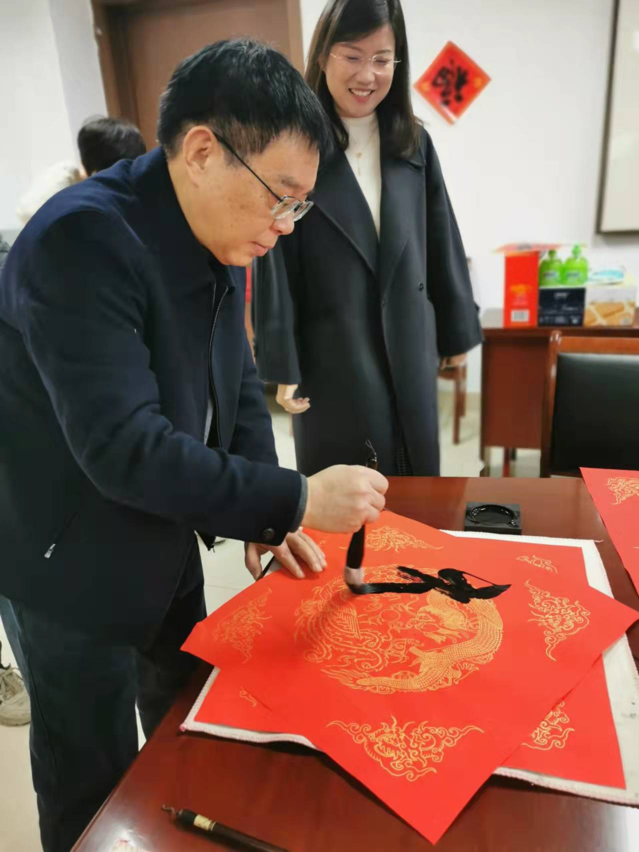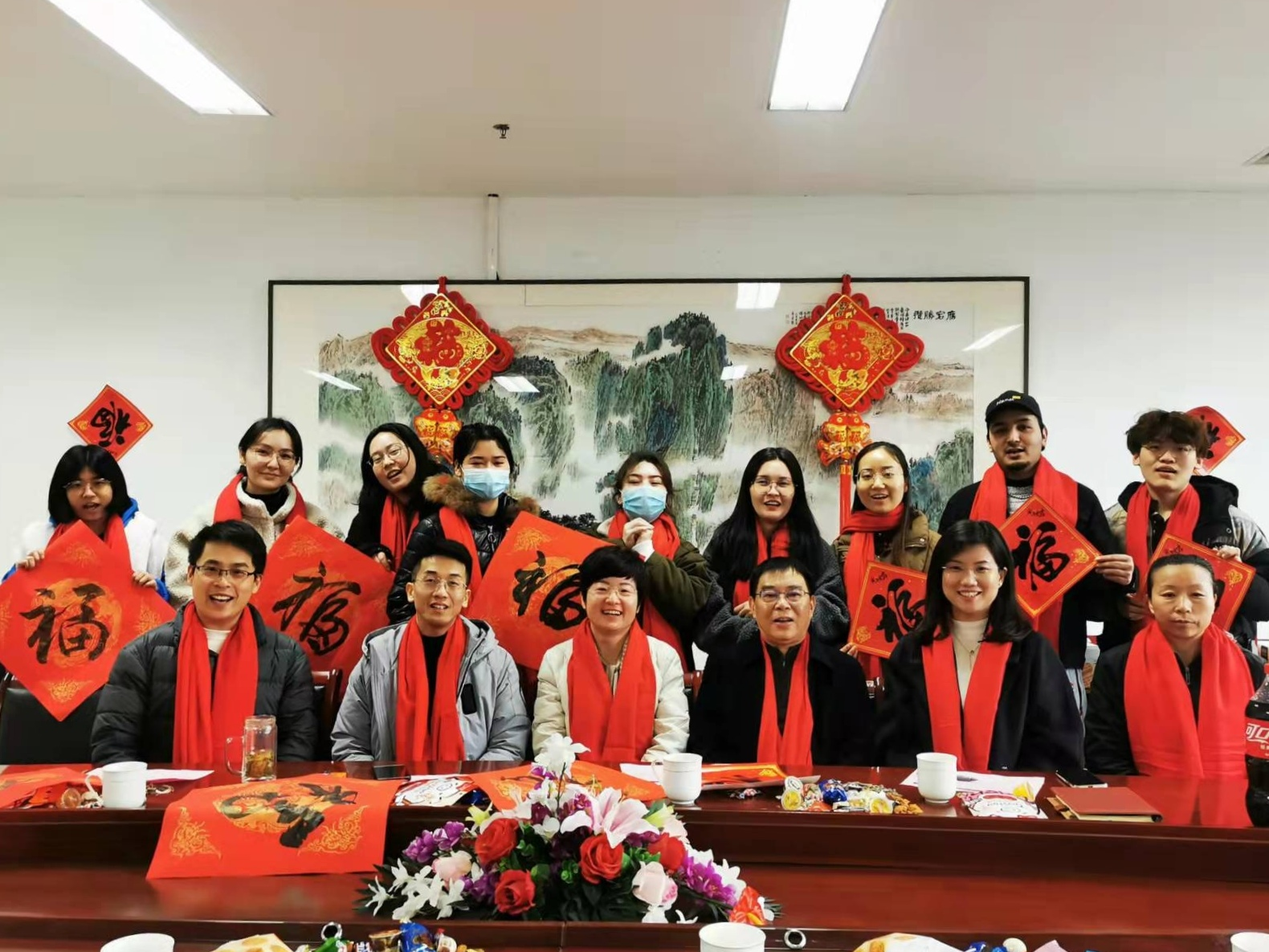 座谈会告一段落,学院领导和师生代表纷纷饶有兴致地在现场写下“福”字,寓意给老师和学生送去新春祝福。大家相互评点夸赞,欢声笑语一片,现场气氛格外热闹温馨。最后,学院领导亲手为留校师生发放新年大礼包、羊绒围巾等慰问品,送上温暖的新春祝福,并与在场师生合影留念。