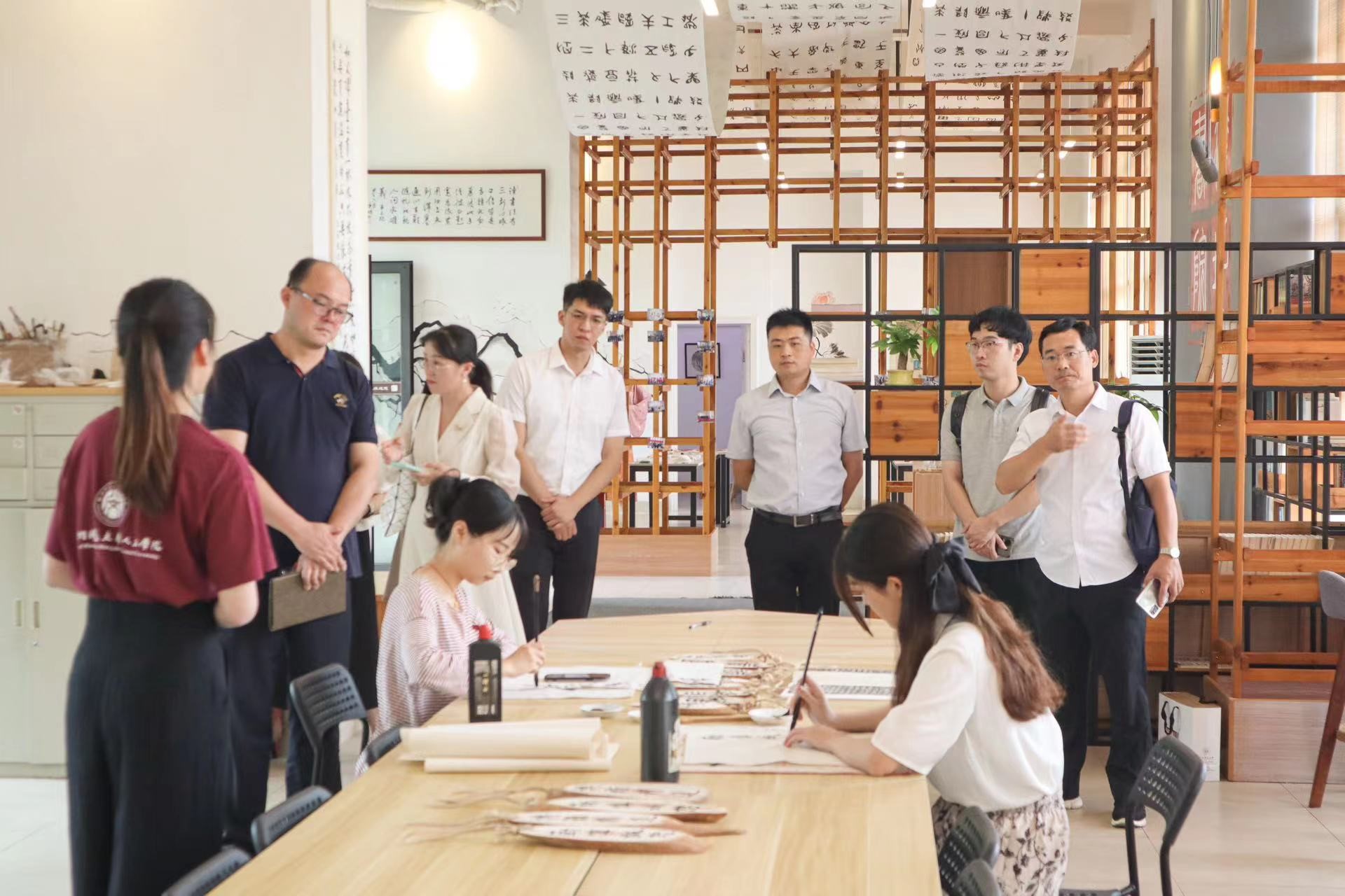 随后,学生负责人陈佳滢向领导们介绍了以泽地书院为阵地开展活动的三大特色社团。嘉礼华服社着重通过研究古代服饰、制作古代首饰,深入学习中华传统礼仪和文化内涵。繁星文讯社日常开展文史读书会等大型文学阅读活动;麓溪书画社历史悠久,文化韵味十足,定期在泽地书院开展书画联系和书画展览。现场还展示了华服社日常研究的首饰、弓箭和不同朝代华服,书画社成员现场进行了书法创作。