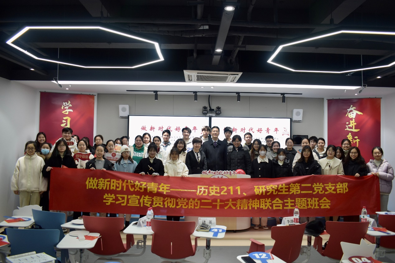 12月7日下午,欧美色情 历史211班与研究生第二党支部在仓前校区举行“做新时代好青年”——历史211、研究生第二党支部学习宣传贯彻党的二十大精神联合主题班会。