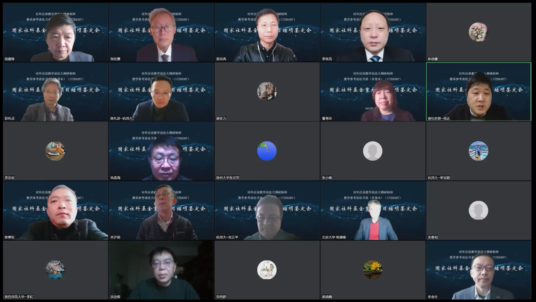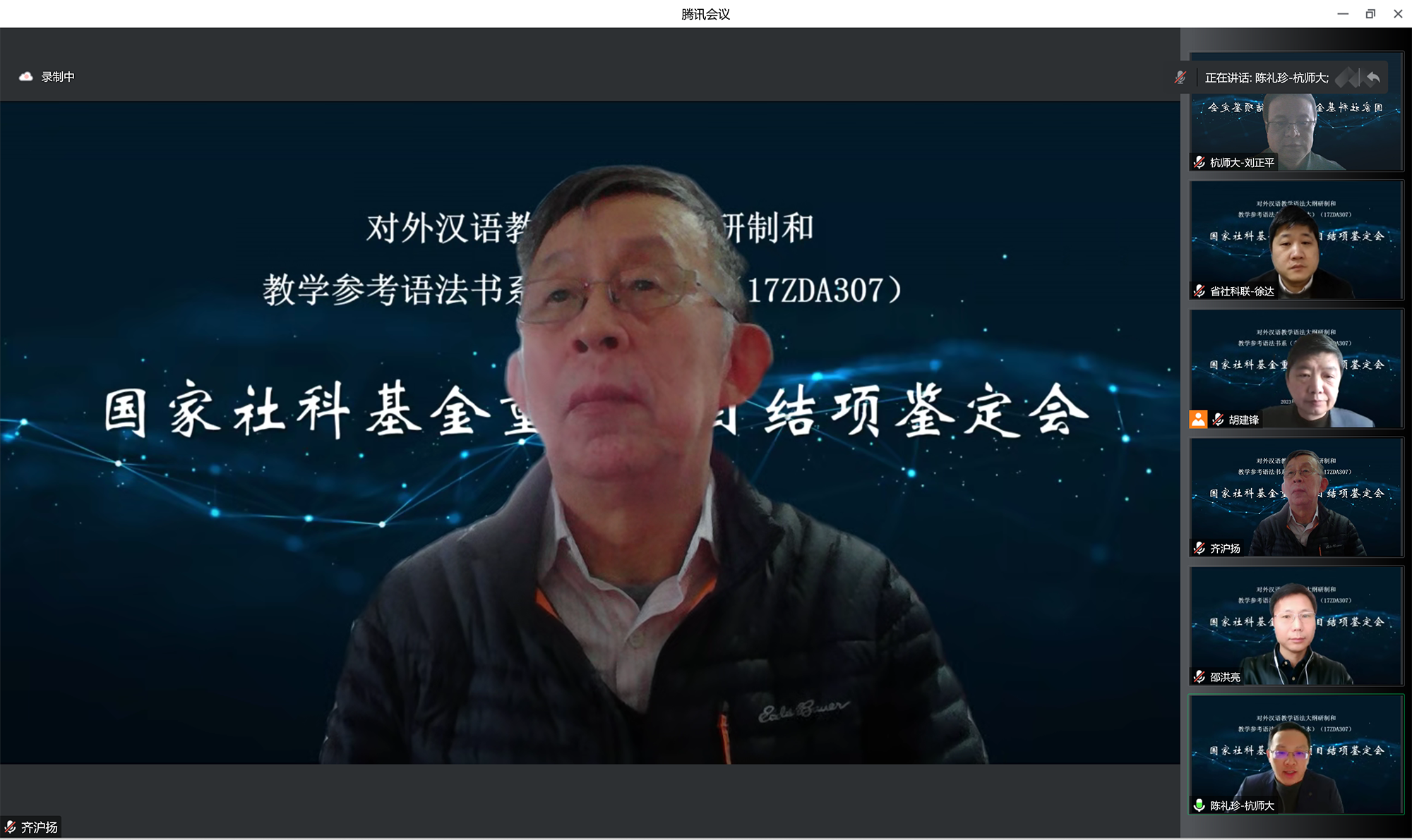 本次结项鉴定会由欧美色情-欧美剧情色情片 主办,受疫情影响,会议采用腾讯会议方式线上召开。北京大学对外汉语教育学院杨德峰教授、浙江大学文学院池昌海教授、首都师范大学文学院史金生教授、浙江师范大学国际文化与教育学院陈青松教授、上海师范大学对外汉语学院曹秀玲教授为专家组成员。浙江省社科联规划处副处长徐达,杭州师范大学科研处副处长陈礼珍,欧美色情-欧美剧情色情片 院长洪治纲、副院长刘正平等出席了会议。参加会议的还有课题组首席专家齐沪扬教授,各子课题负责人北京语言大学张旺熹教授、黄山学院李铁范教授、上海师范大学胡建锋副教授,以及课题组部分成员30余人。