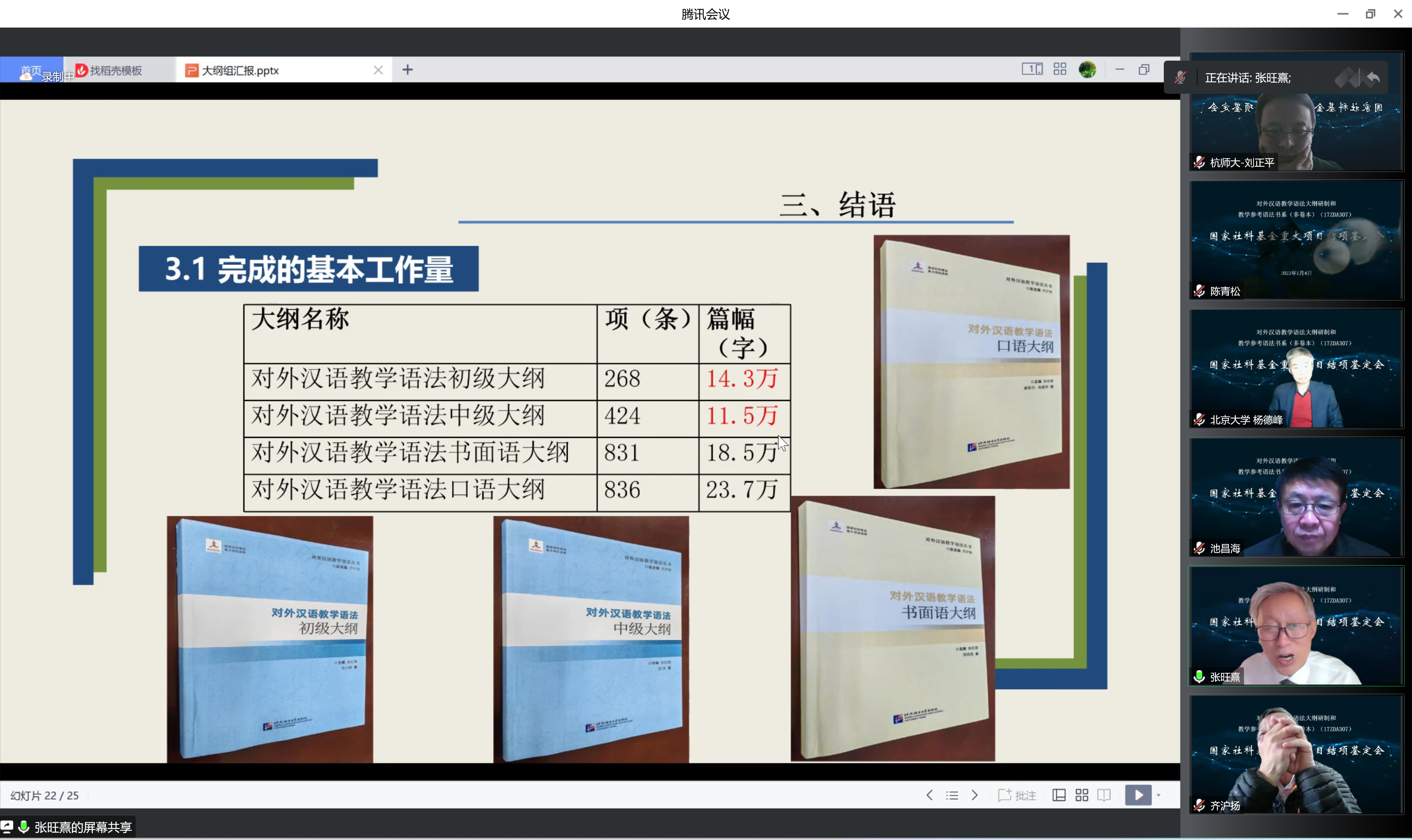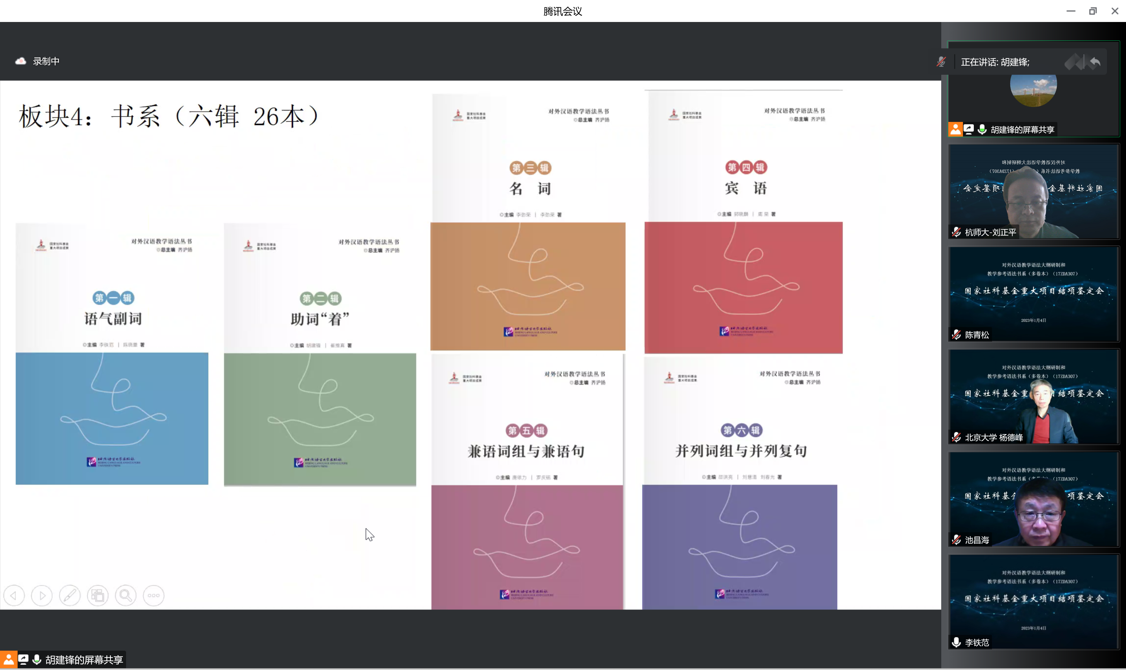 会议第二阶段由专家组组长杨德峰教授主持。上海外国语大学邵洪亮副教授代齐沪扬教授进行了结项汇报。整个项目研究工作持续了4年多的时间,课题组召开线下、线上学术研讨会、课题协调会百余次,微信、网络联系信息千余条,发表作为阶段性成果的论文100余篇,作为最终成果的“对外汉语教学语法系列丛书”,共40册,700余万字,包括对外汉语教学语法大纲4册、对外汉语教学参考语法书系共6辑26册、近二十年与对外汉语教学语法相关的资料综述2套(各4册)以及研究论文集2本。