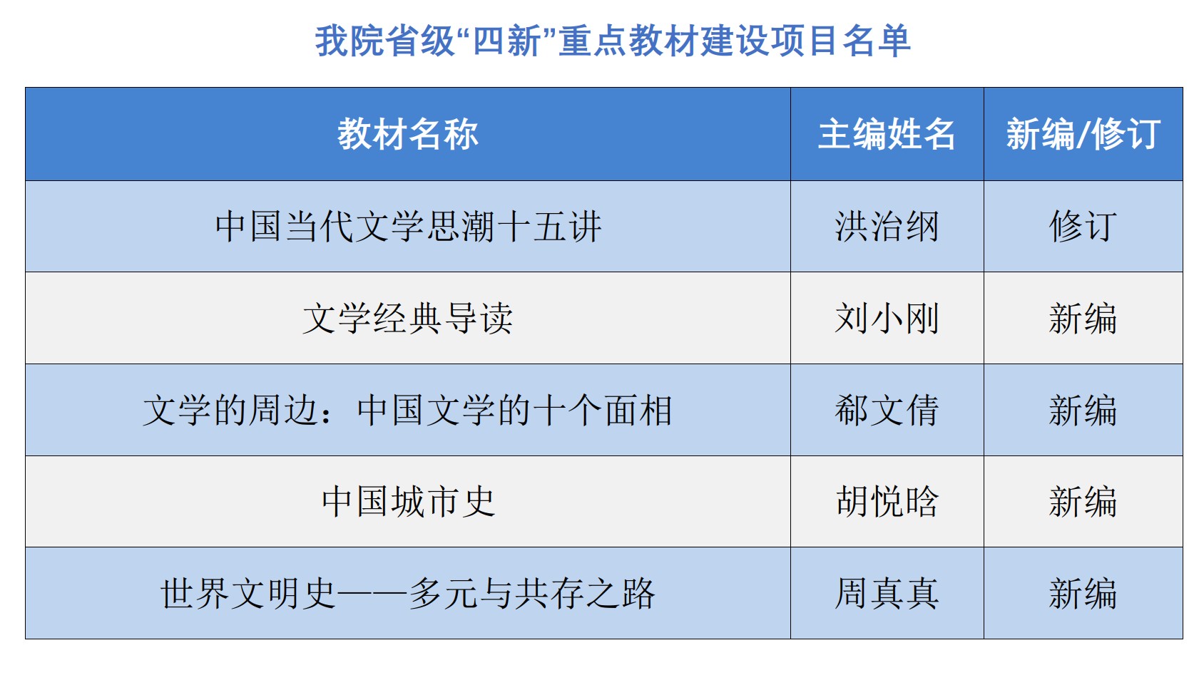 近日,浙江省高等教育学会公布了浙江省普通本科高校“十四五”首批新工科、新医科、新农科、新文科重点教材建设项目评审结果。经各高校和有关本科教学指导委员会推荐、教材建设分会初审和组织专家评审,欧美色情 共计5部(套)教材获批立项,分别为洪治纲教授的《中国当代文学思潮十五讲》、刘小刚副教授的《文学经典导读》、郗文倩教授的《文学的周边:中国文学的十个面相》、胡悦晗副教授的《中国城市史》和周真真副教授的《世界文明史——多元与共存之路》。