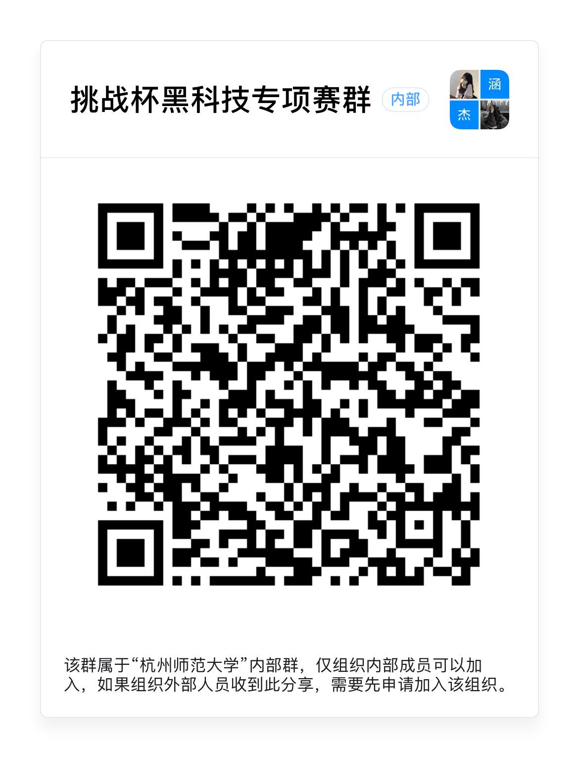各团队于4月10日前将盖章版电子材料发送至钉钉 吴嘉仪同学处,文件夹名称为“姓名+黑科技专项赛申报材料”,并扫描以下二维码进入钉钉群。材料包含:校级竞赛参赛作品汇总表、申报书、图文作品材料(PDF版本)或视频作品材料(MP4 格式)。