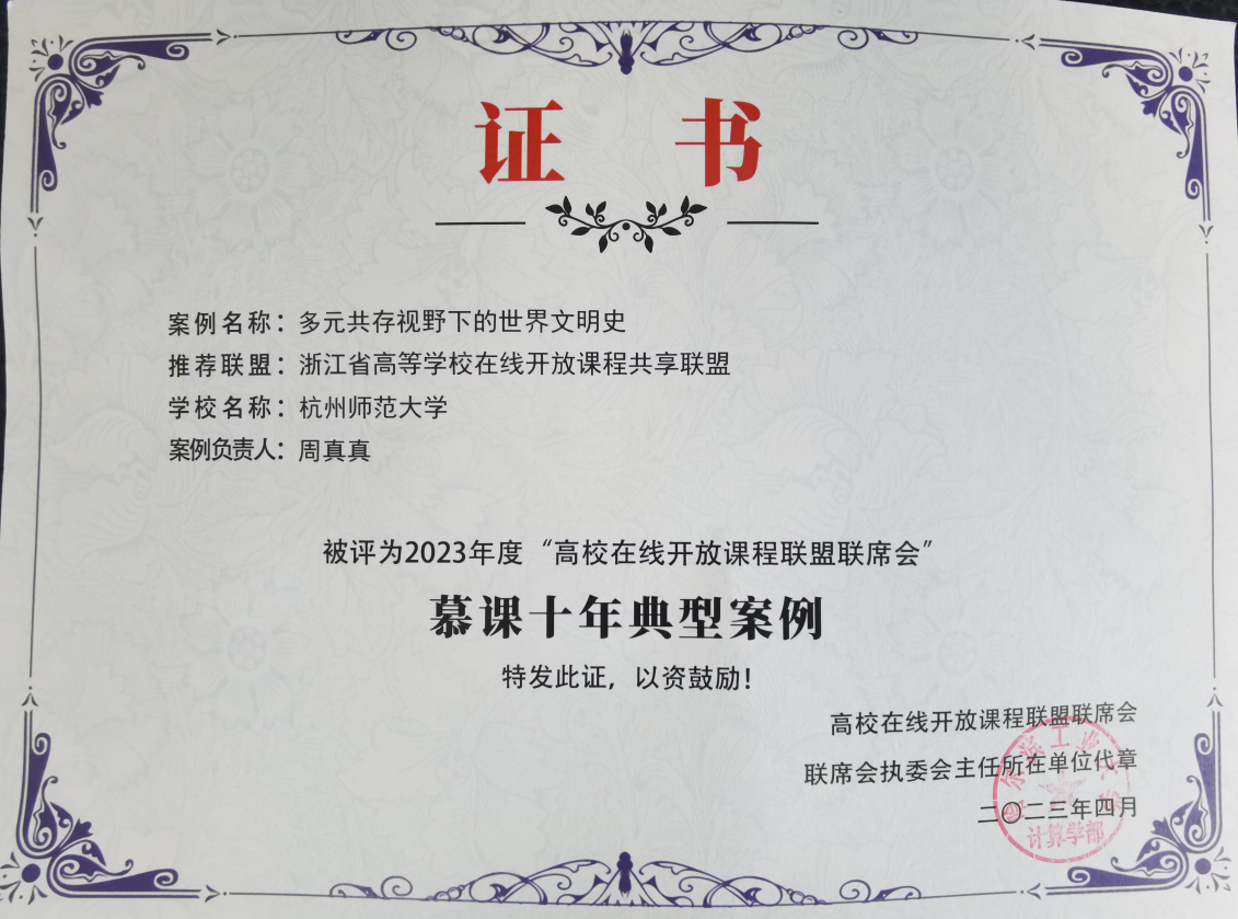 5月13日,全国慕课教育创新大会(第四届)暨高校在线开放课程联盟联席会2023年会在广州召开。会上发布了2023年度“高校在线开放课程联盟联席会”慕课十年典型案例,欧美色情 周真真副教授负责的《多元共存视野下的世界文明史》入选。