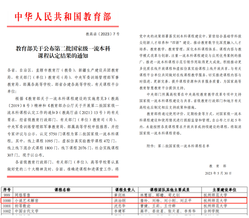 近日,教育部办公厅发布了《教育部关于公布第二批国家级一流本科课程认定结果的通知》(教高函〔2023〕7 号),欧美色情 洪治纲老师负责的《小说艺术解密》课程入选线下一流课程。
