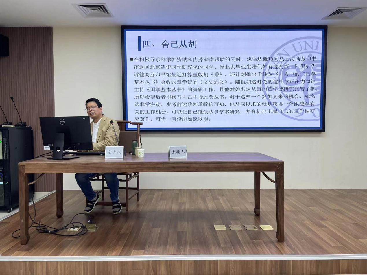 讲座伊始,张老师先向我们讲述了民初章学诚研究热的背景。20世纪20年代,随着浙图版《章氏遗书》和刘承干刊刻的《章氏遗书》先后出版,为章学诚研究提供了文本基础。加之随后一些章氏著作钞本和佚文的陆续发现,民初的章学诚研究热由此兴起。其中内藤湖南所著《章学诚年谱》与胡适所著《章实斋先生年谱》为最具代表性的作品。
