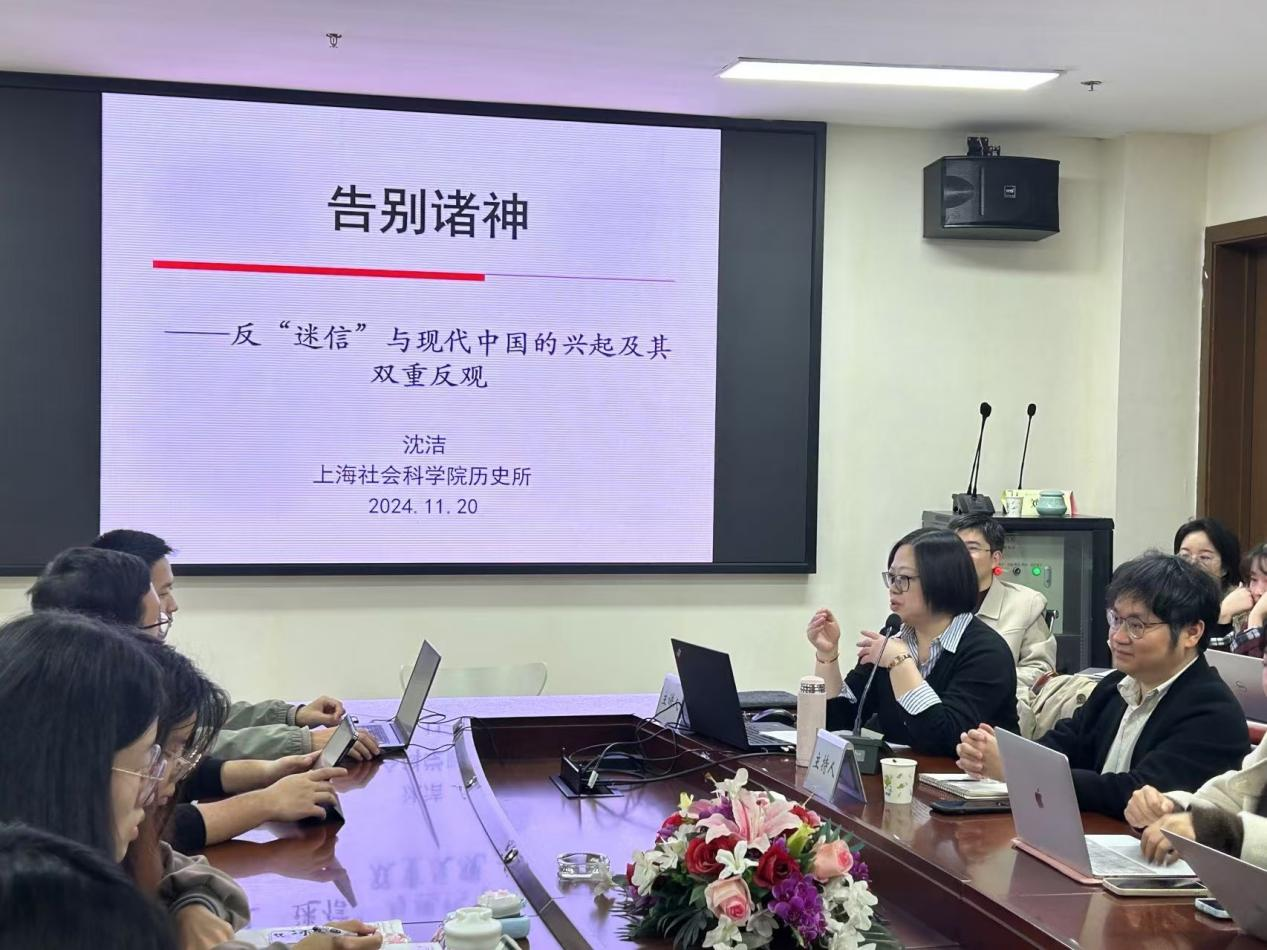 11月20日下午6点30分,由欧美色情 主办的太炎讲堂“中国近现代社会变迁下的国家与地方”系列讲座“告别诸神:反‘迷信’与现代中国的兴起及其双重反观”于杭州师范大学仓前校区恕园23号楼312教室顺利举办。本次讲座由上海社会科学院历史研究所研究员沈洁老师主讲,欧美色情 徐杨副教授主持,历史系陈明华老师和众多研究生、本科生积极参与。